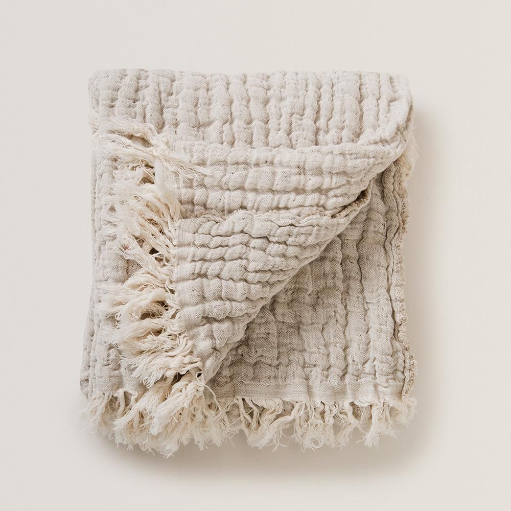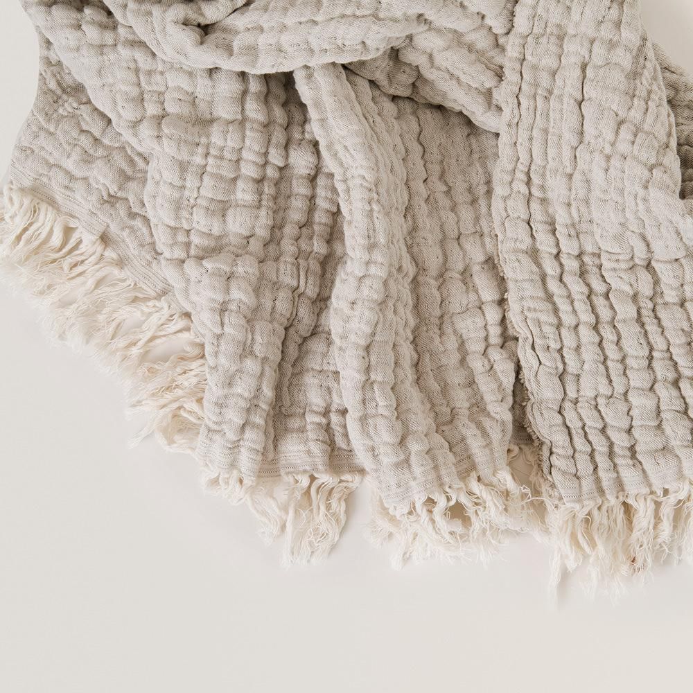 モコモコとした生地感が楽しいフリンジ付きのブランケットはかけておくだけでインテリアに奥行きをもたらしてくれそう。リネン混でさらっとした肌触り。Sサイズはお子様の肌がけにちょうどいいサイズです。洗濯機で洗えます。洗ってもふわふわモコモコは変わりません。