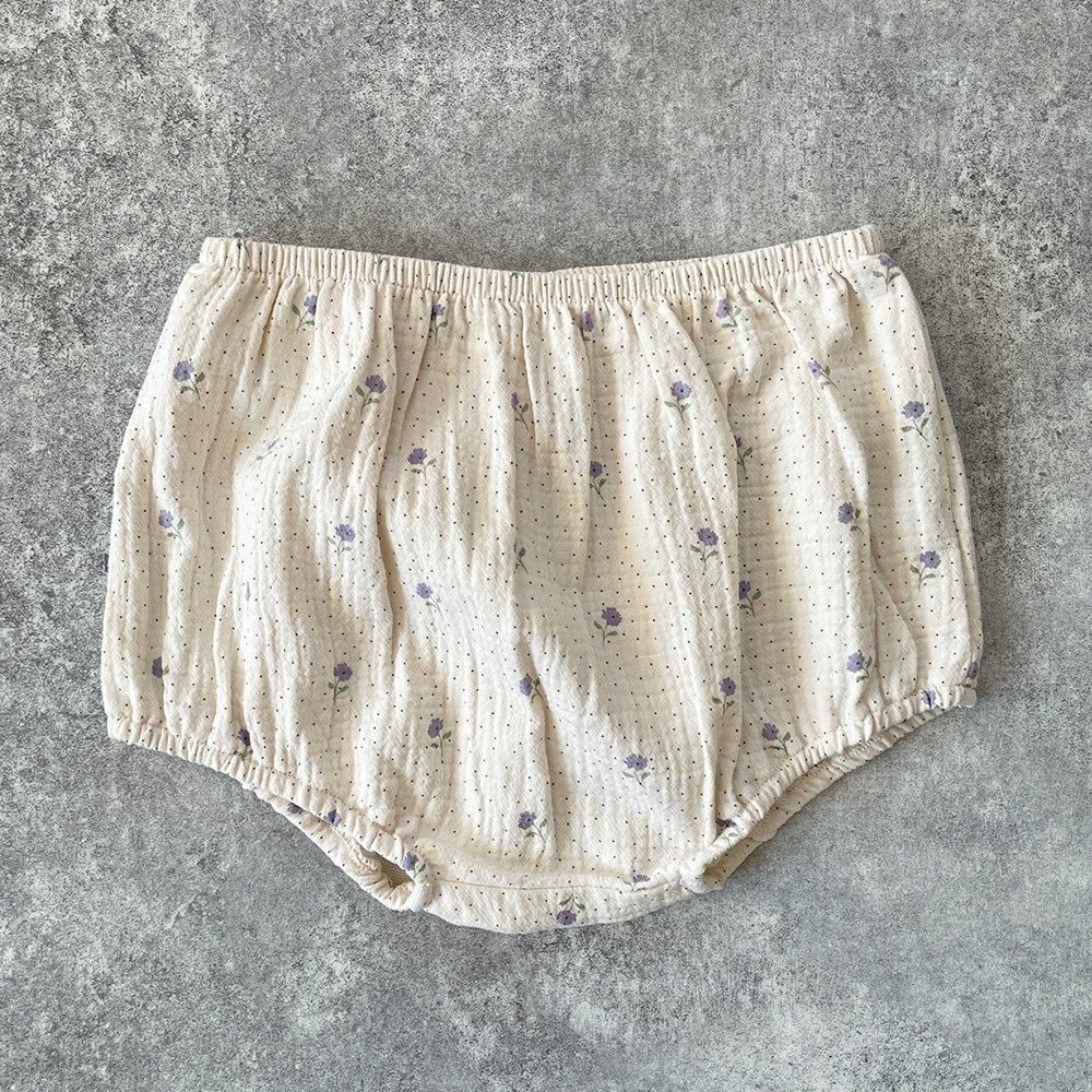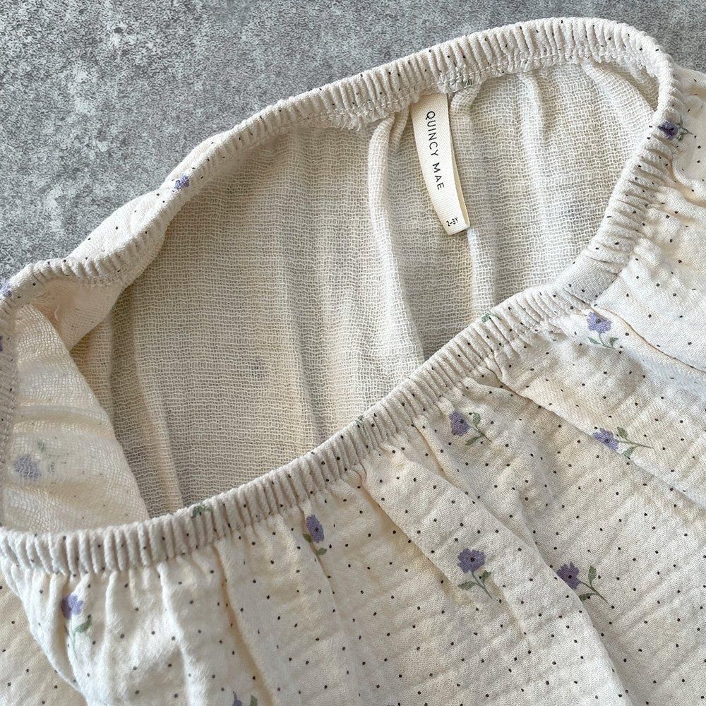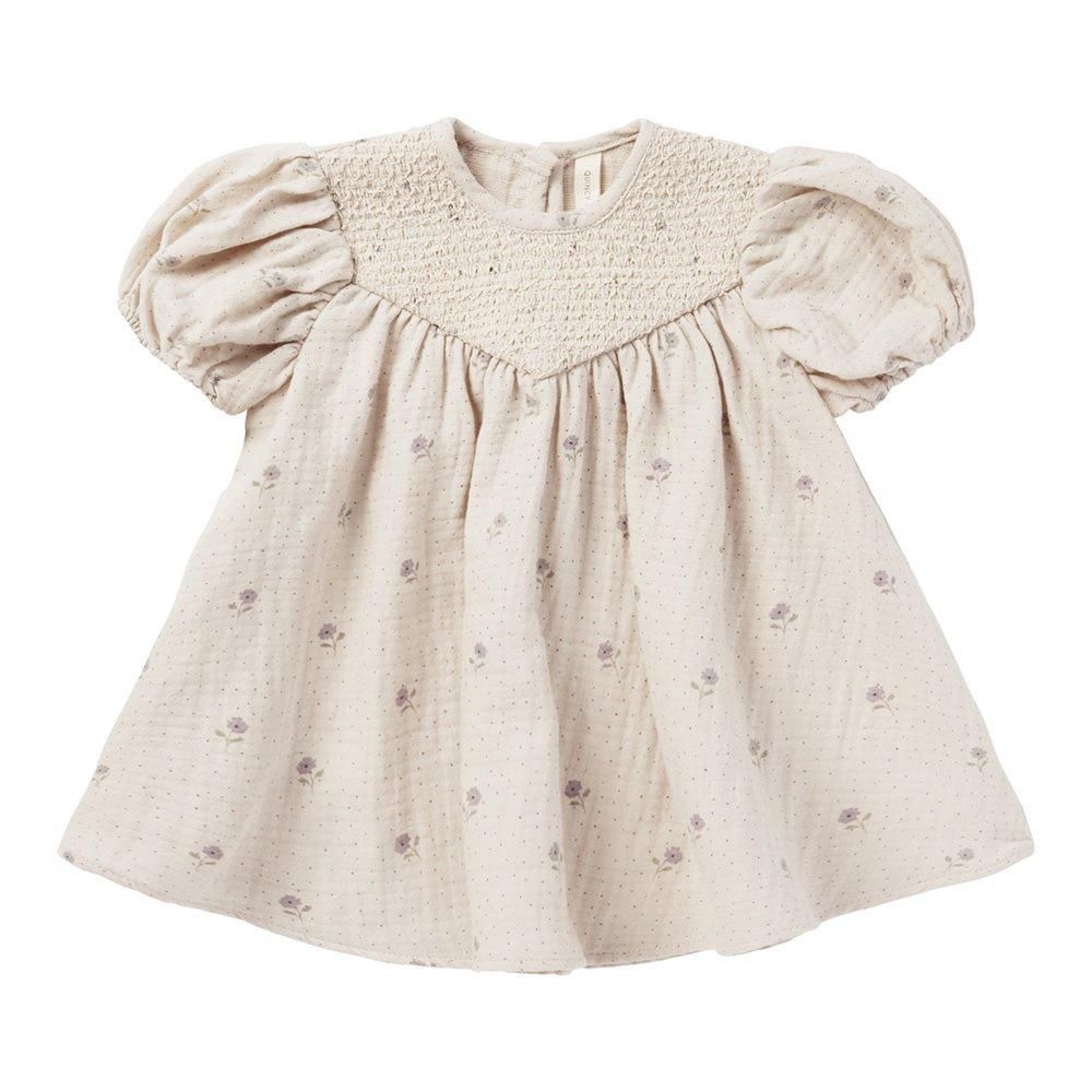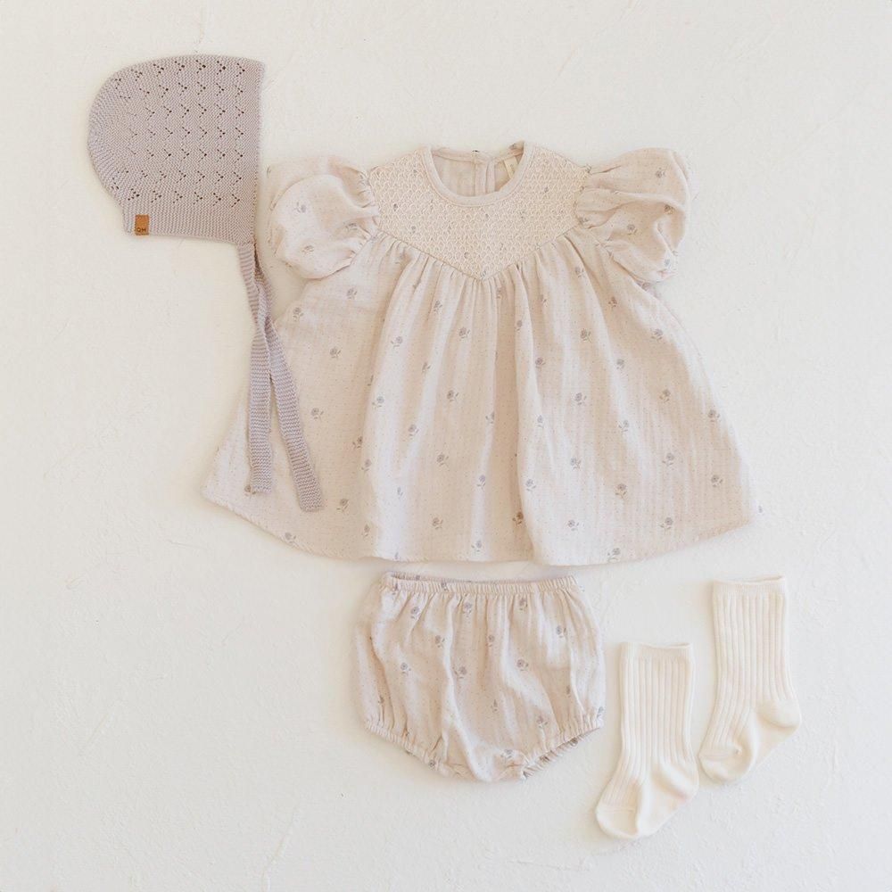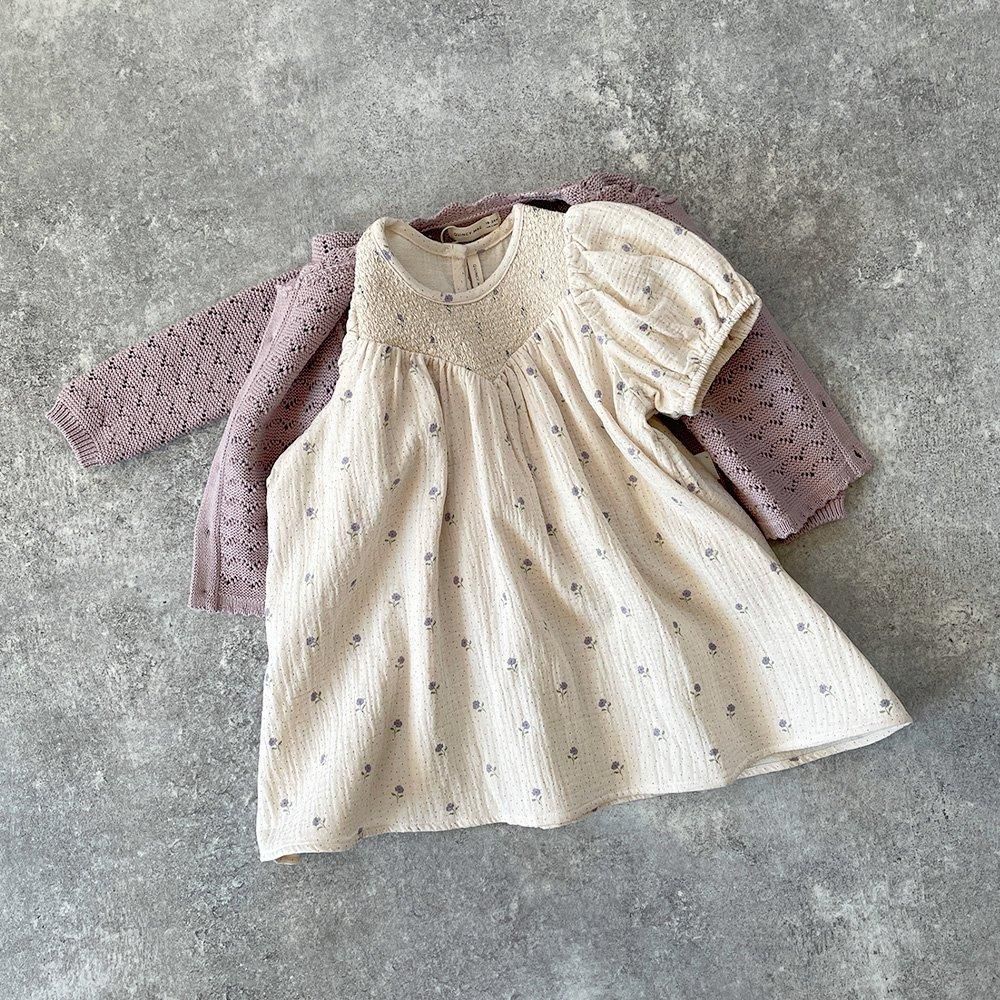 アイボリーにラベンダーカラーの小花とドット生地だけでもかわいいのですが、おそでポワンと胸元のスモッキングで愛らしさが止まらないワンピースです。