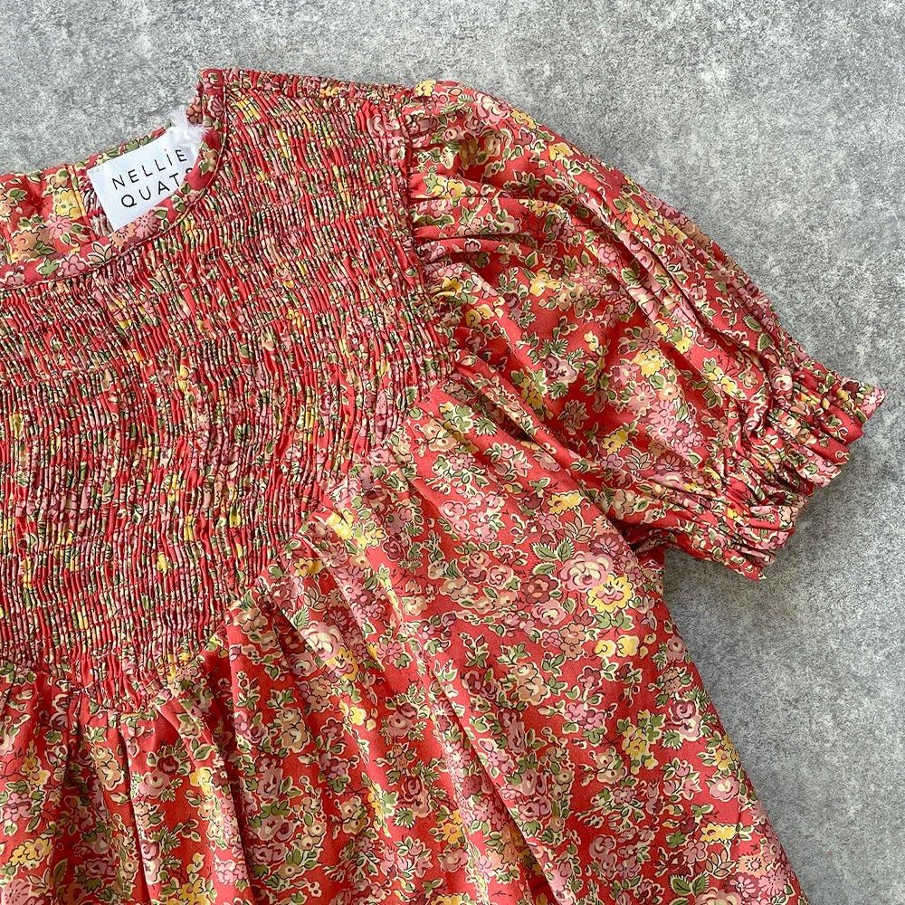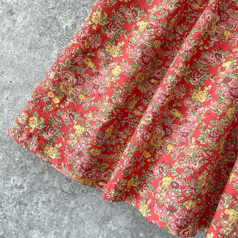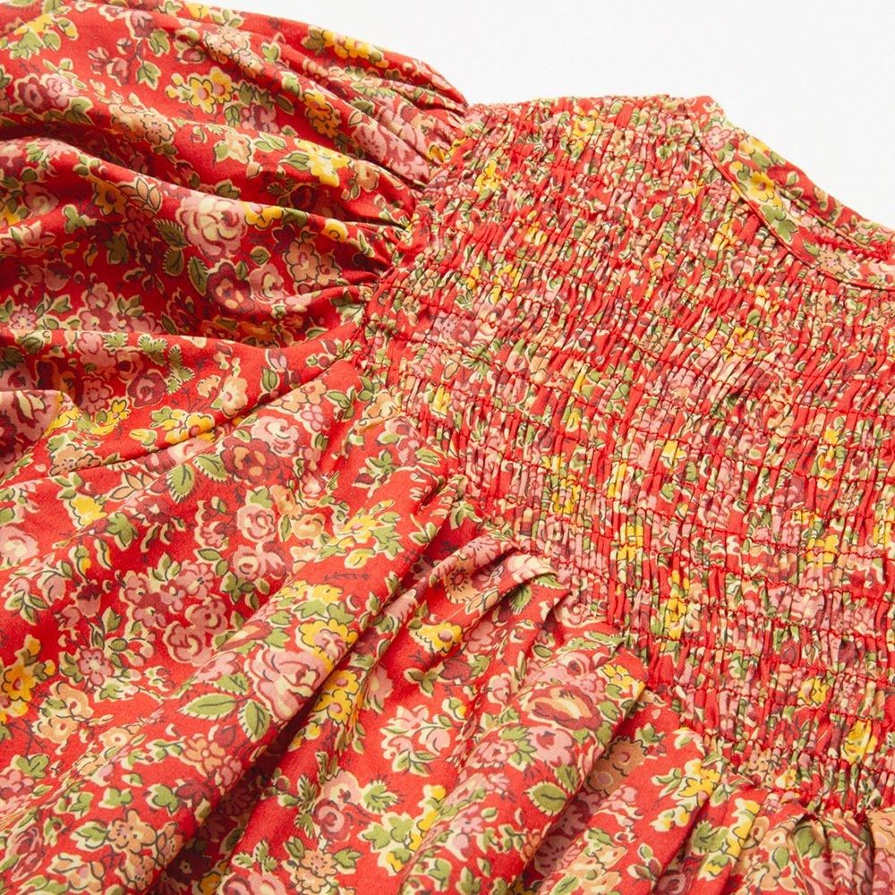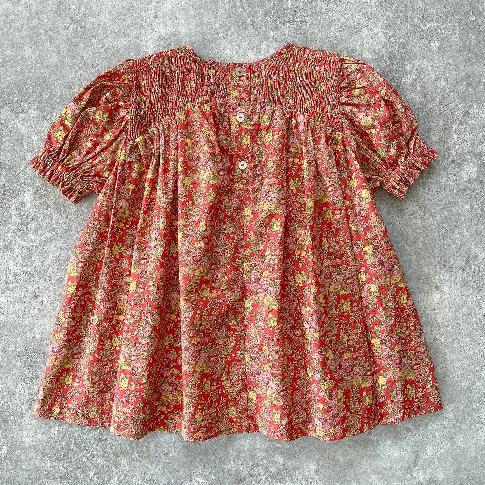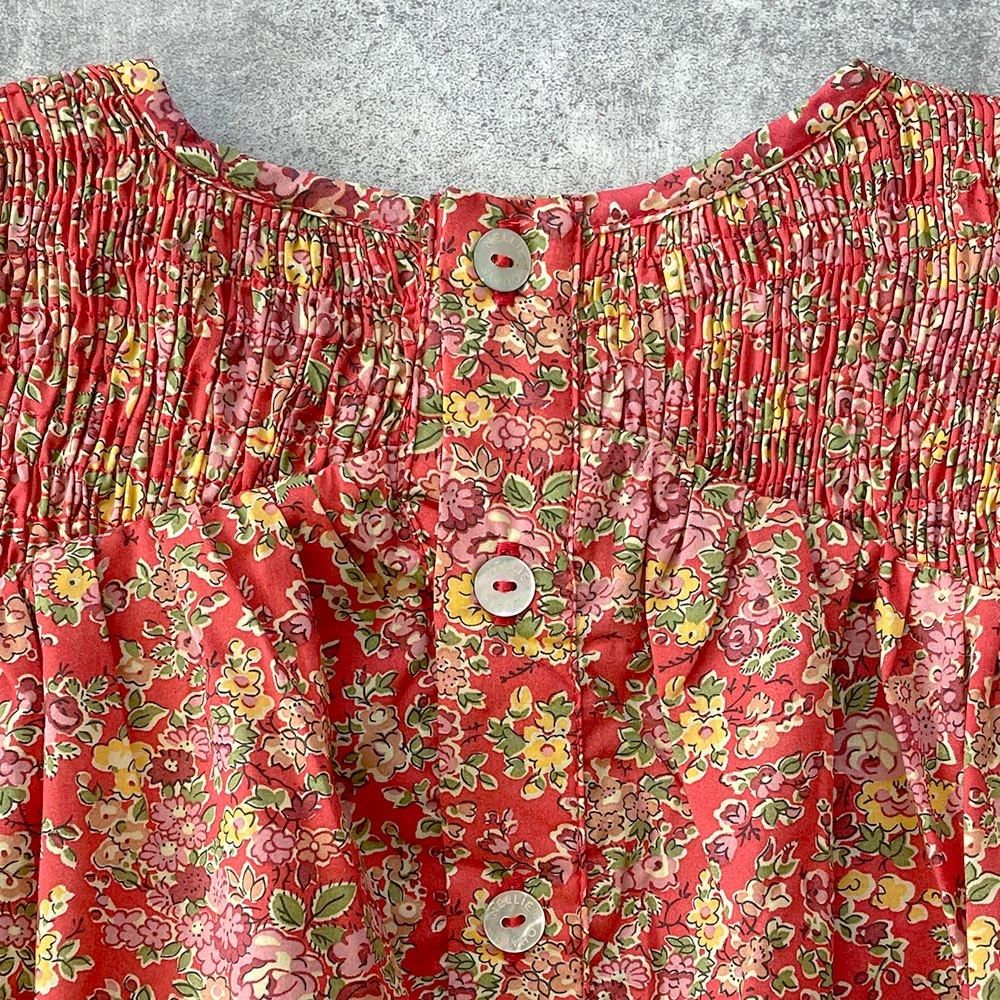 こまかなシャーリングが入ったワンピース。リバティのレッドベースが大人っぽい生地ですが、袖の丸みやシルエットが子どもらしくキュート。リバティのタナローン生地は薄手でさらさらとした肌触り。夏の暑い時期にも心地よくお召しいただけます。