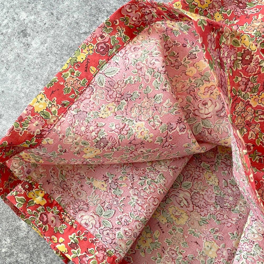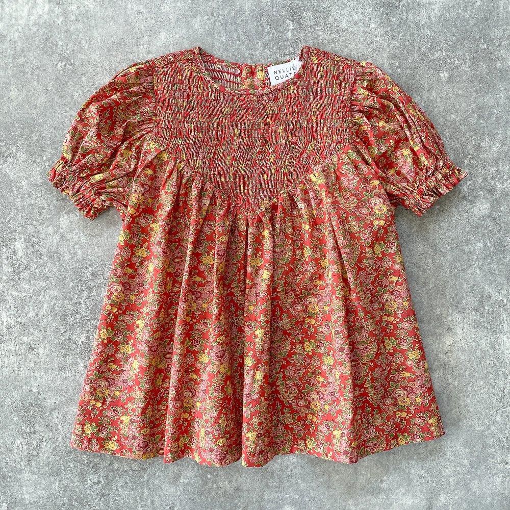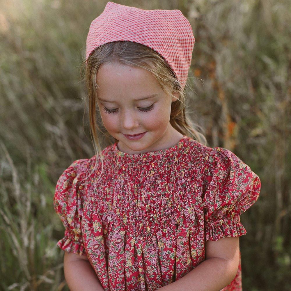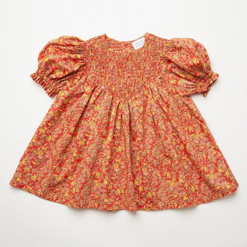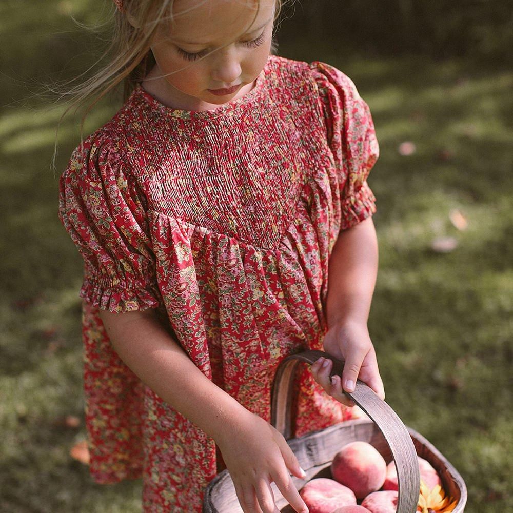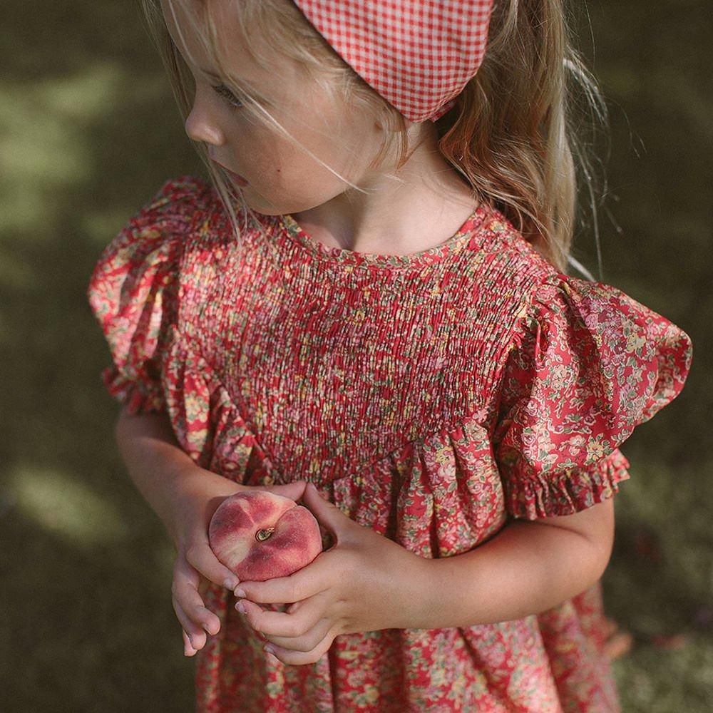 こまかなシャーリングが入ったワンピース。リバティのレッドベースが大人っぽい生地ですが、袖の丸みやシルエットが子どもらしくキュート。リバティのタナローン生地は薄手でさらさらとした肌触り。夏の暑い時期にも心地よくお召しいただけます。