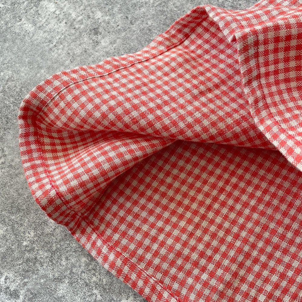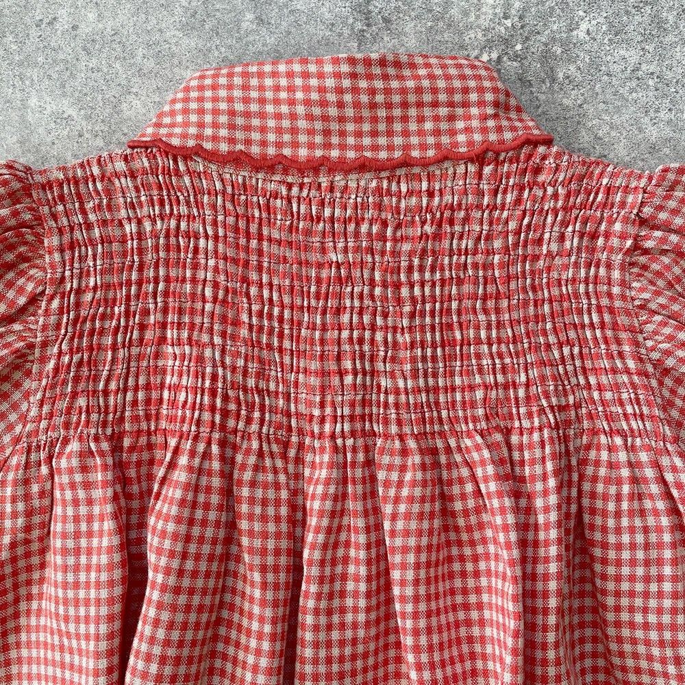 こちらも襟の縁かがりの赤が全体を引き締めてくれています。また、リネンは吸水性が高いので、湿度の高い日本にぴったりの素材です。