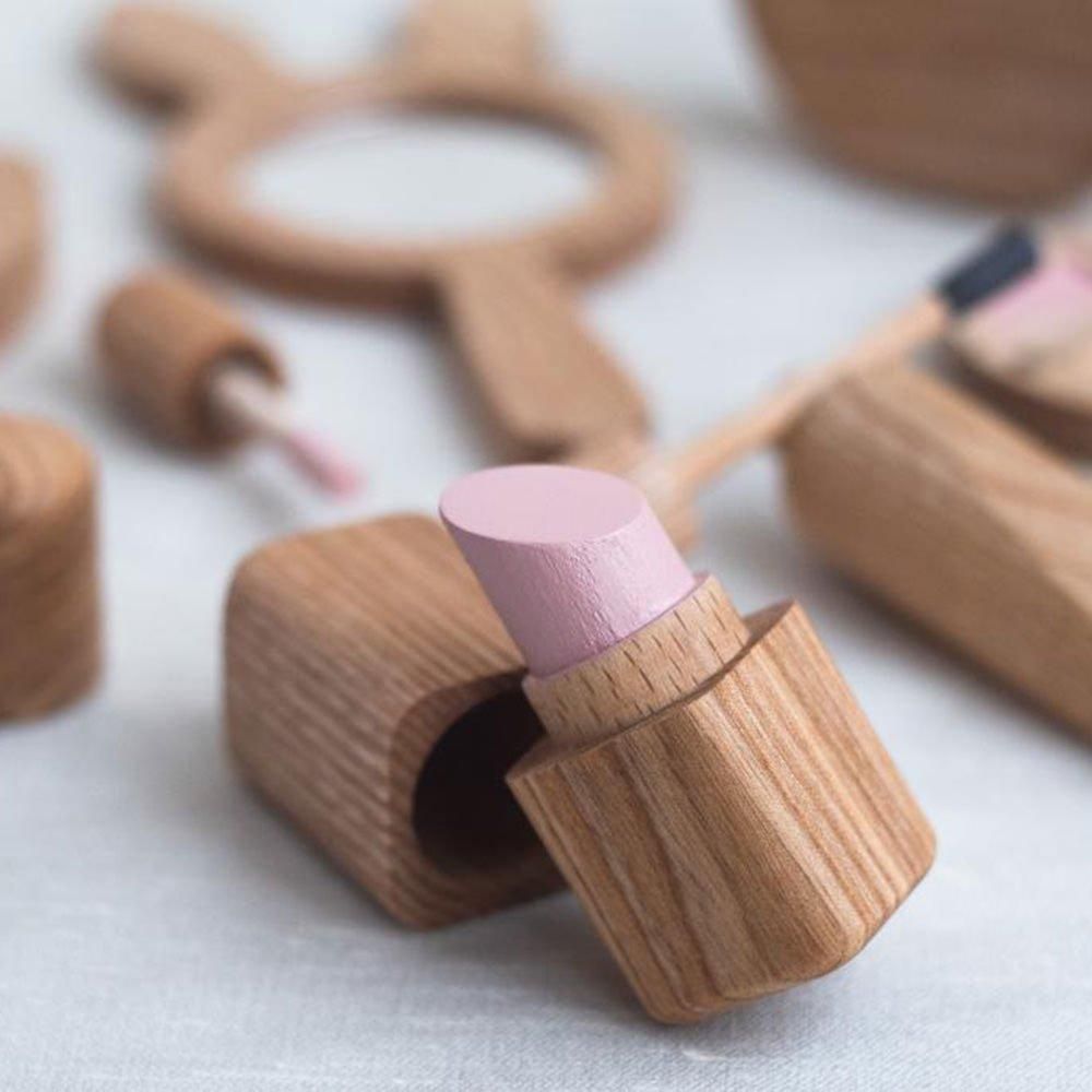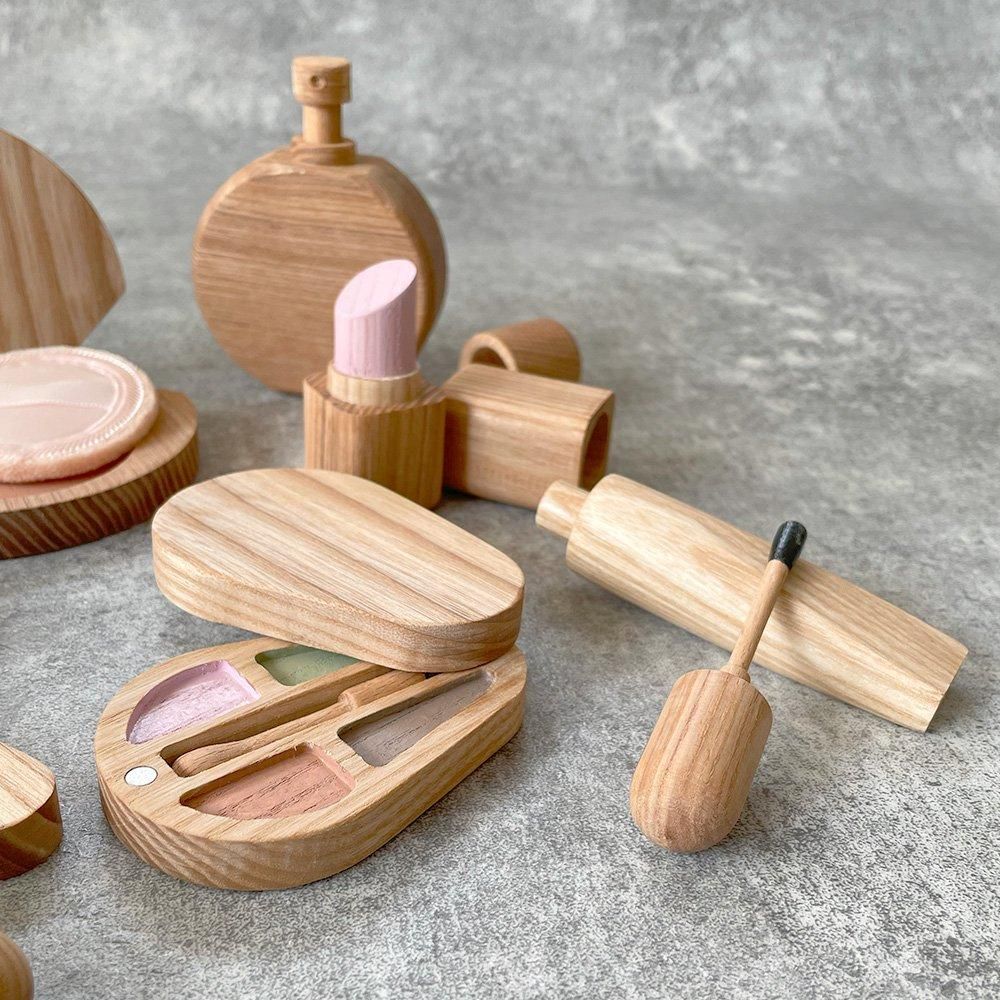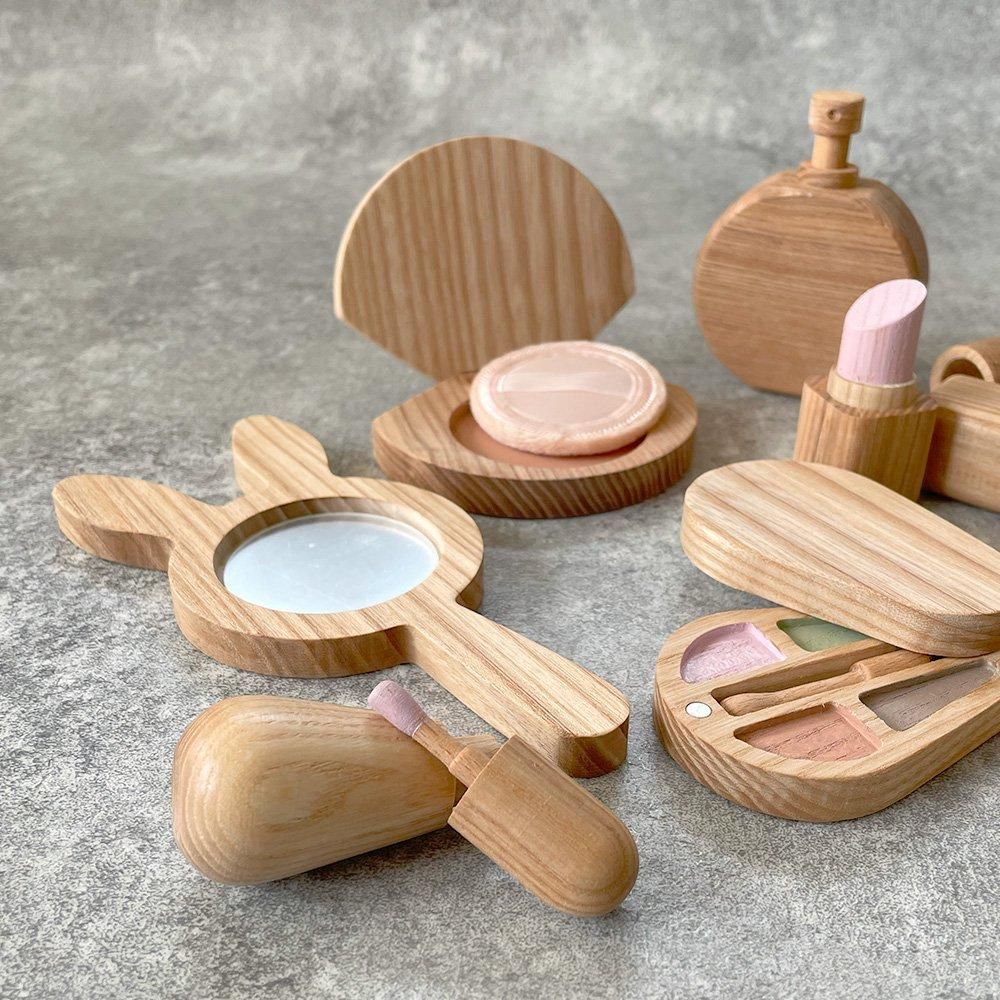 なんでも真似したい年頃のお子さんにおすすめのメイクセット。全て木製で水性塗料が使用されている安心の素材です。細かいところまで本物のようにつくられており、大人が見ての楽しい内容となっております。