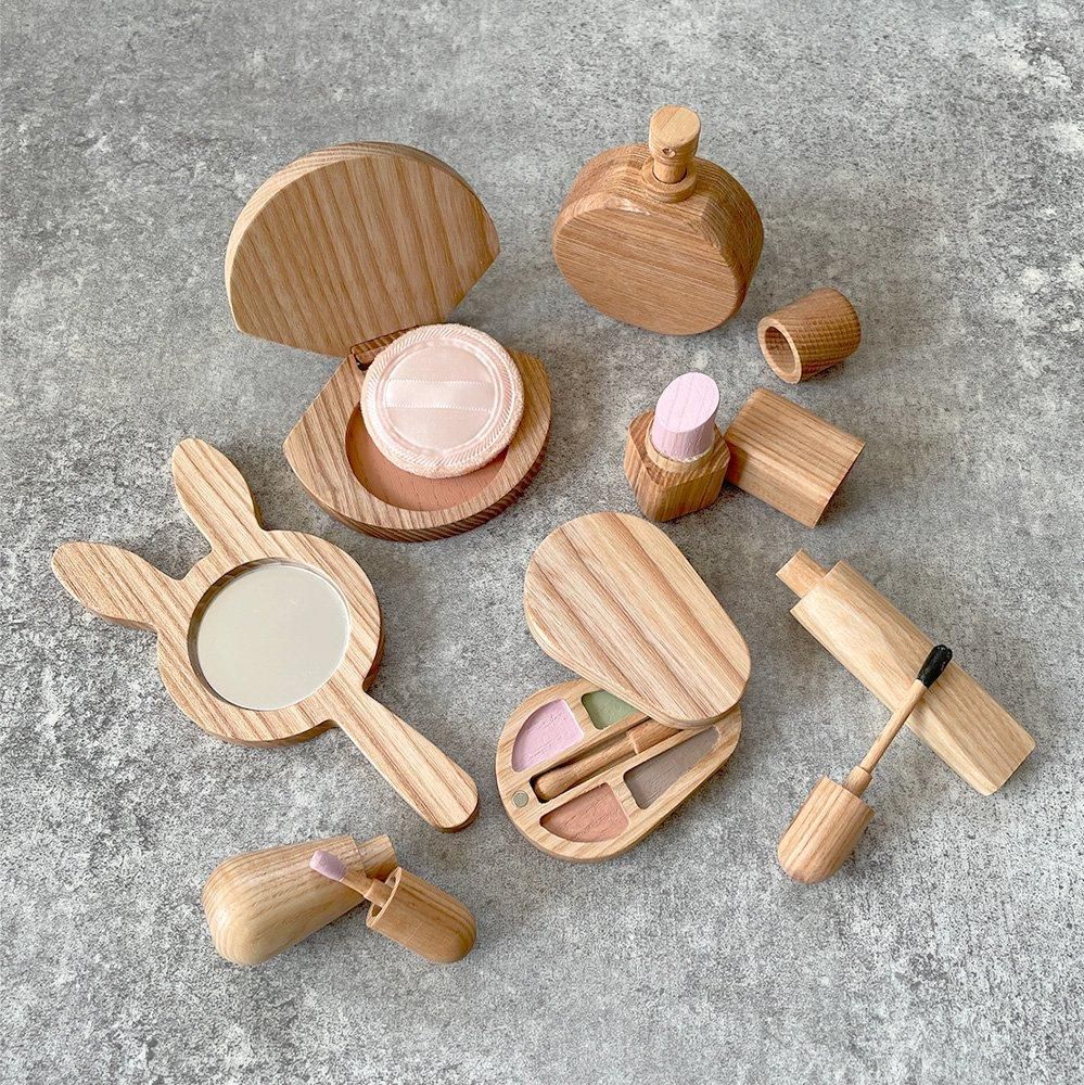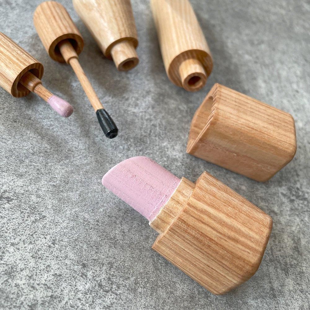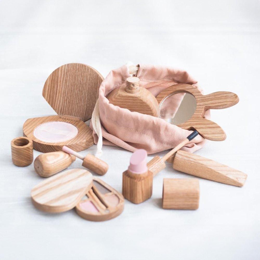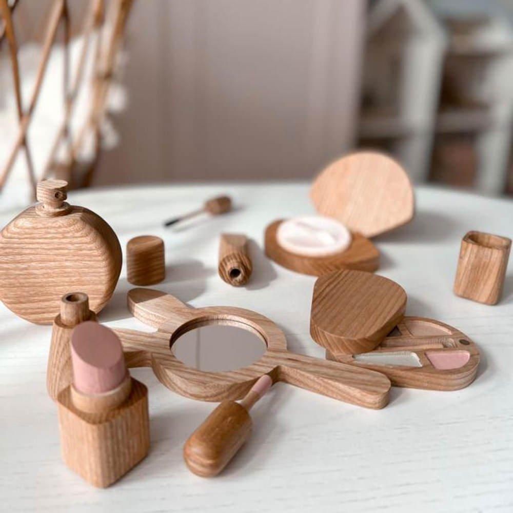 なんでも真似したい年頃のお子さんにおすすめのメイクセット。全て木製で水性塗料が使用されている安心の素材です。細かいところまで本物のようにつくられており、大人が見ての楽しい内容となっております。