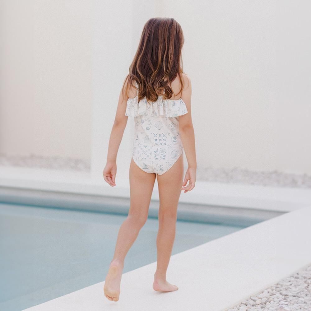 タイル状に描かれた優しいタッチのイラストと、胸元のフリルが可愛らしいスイムウェア。花籠や巻貝、ヨットなど、ポルトガル風のイラストをお子様と楽しんでいただけます。UPF50+です。