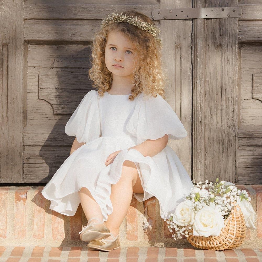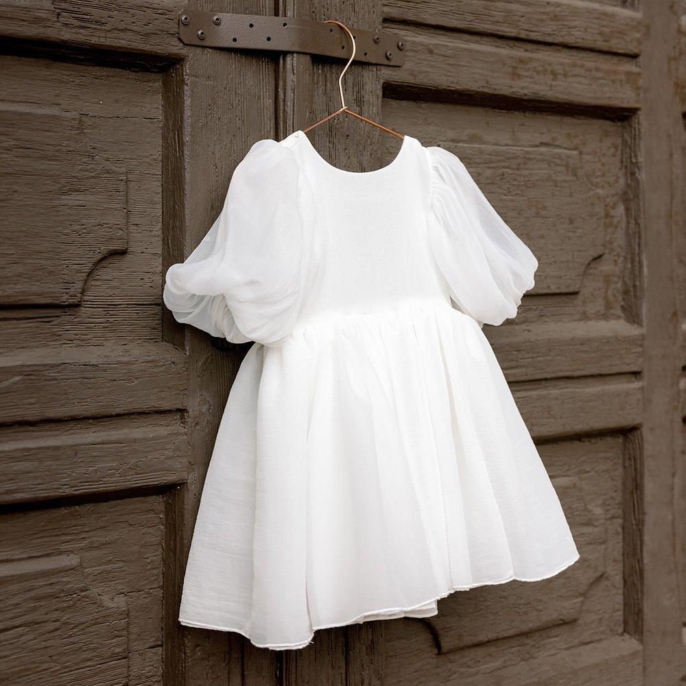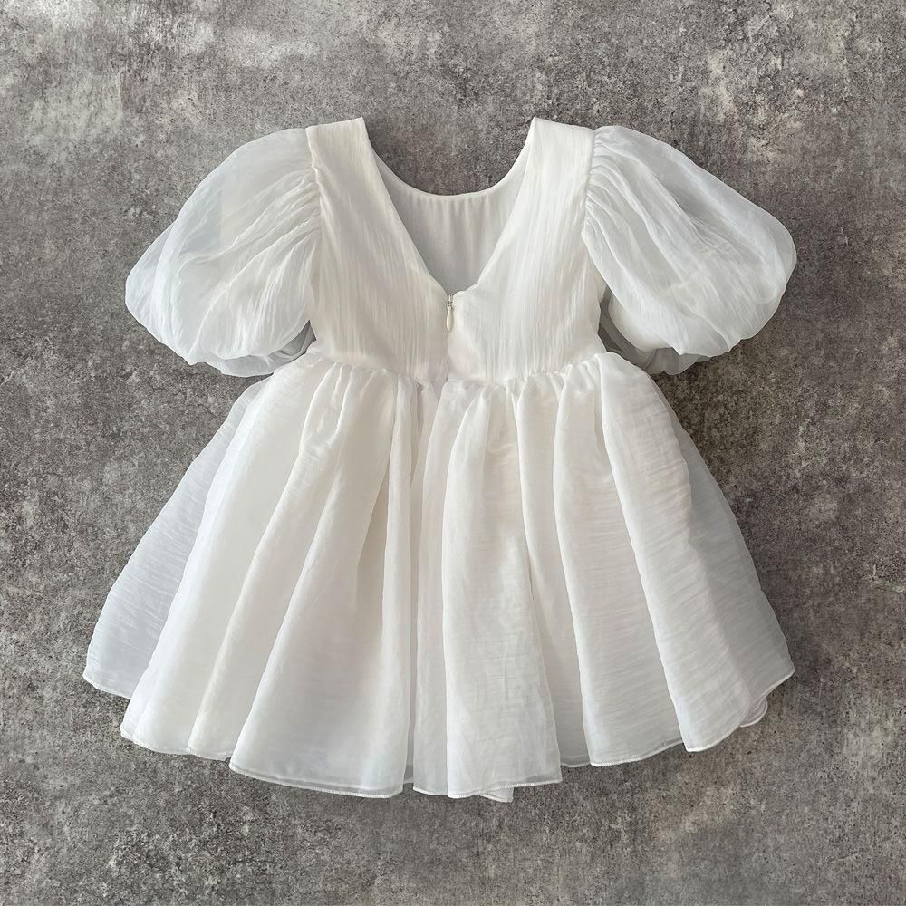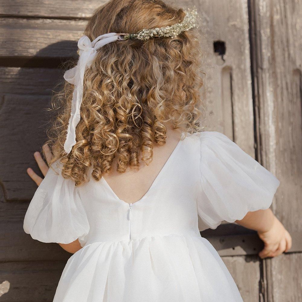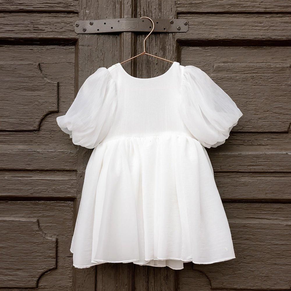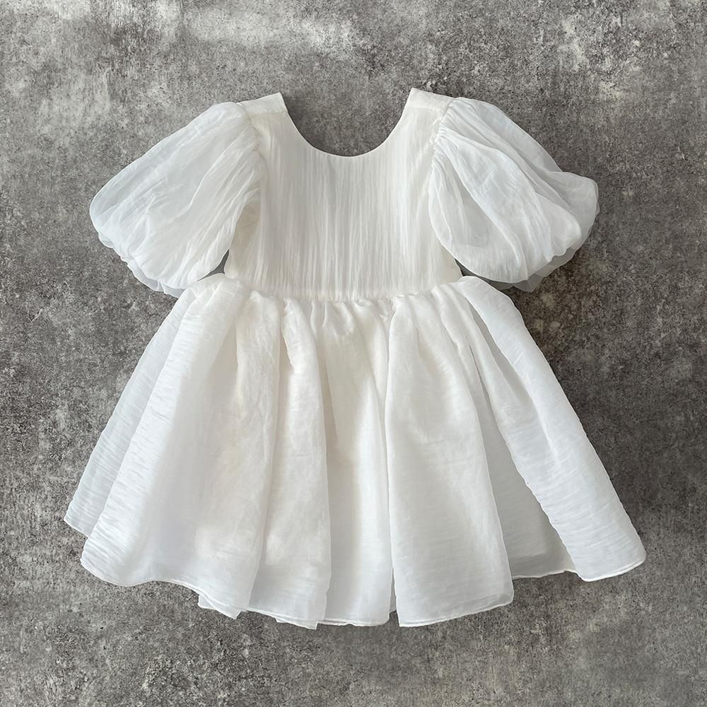 Noraleeで一番人気のSOFIA DRESS。シュリンク加工されたオーガンジーがエアリーで清麗な雰囲気です。スカート部分はチュール生地が挟まれており、ボリュームたっぷり。ほんのり透ける袖とたっぷりのフレアが特別感のあるドレスでお子さまの高潔さに相応しい純白カラーです。