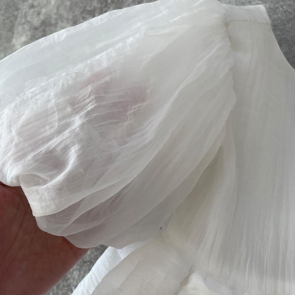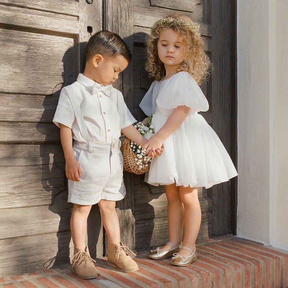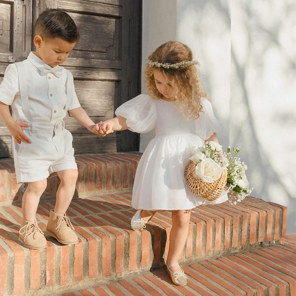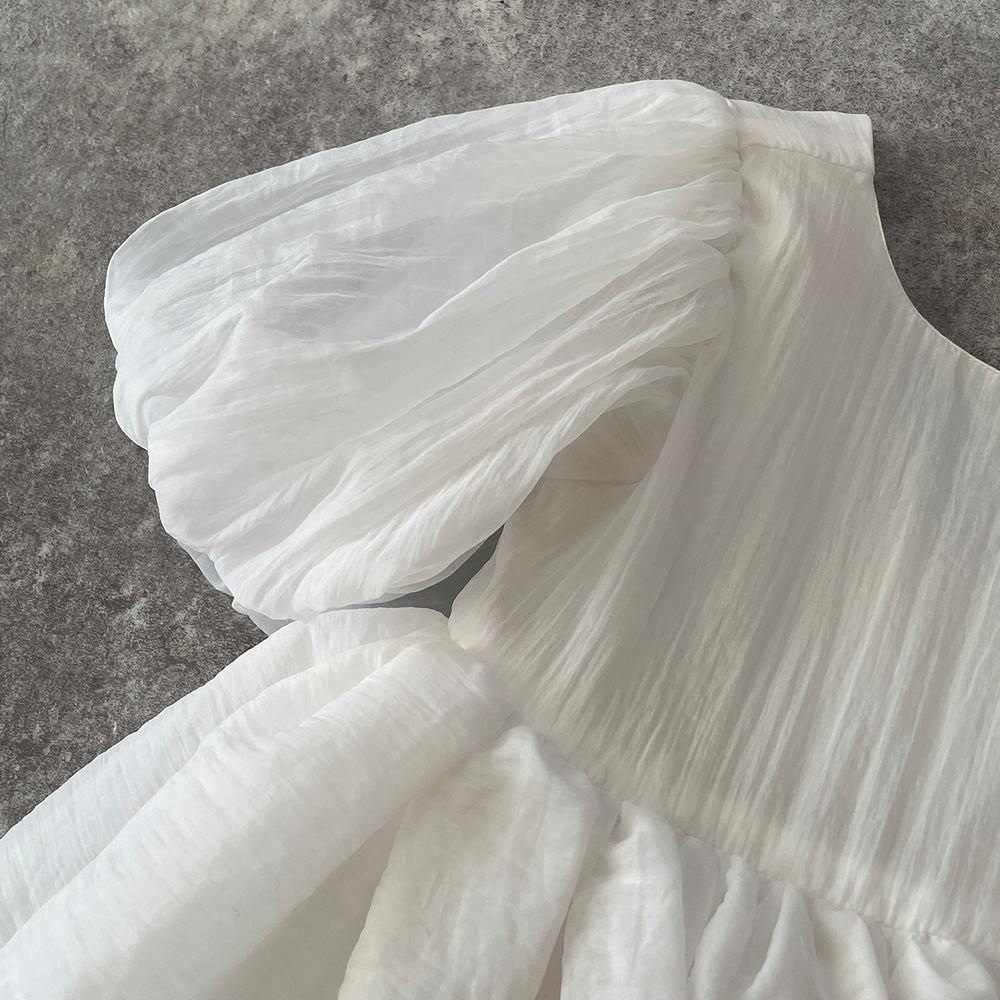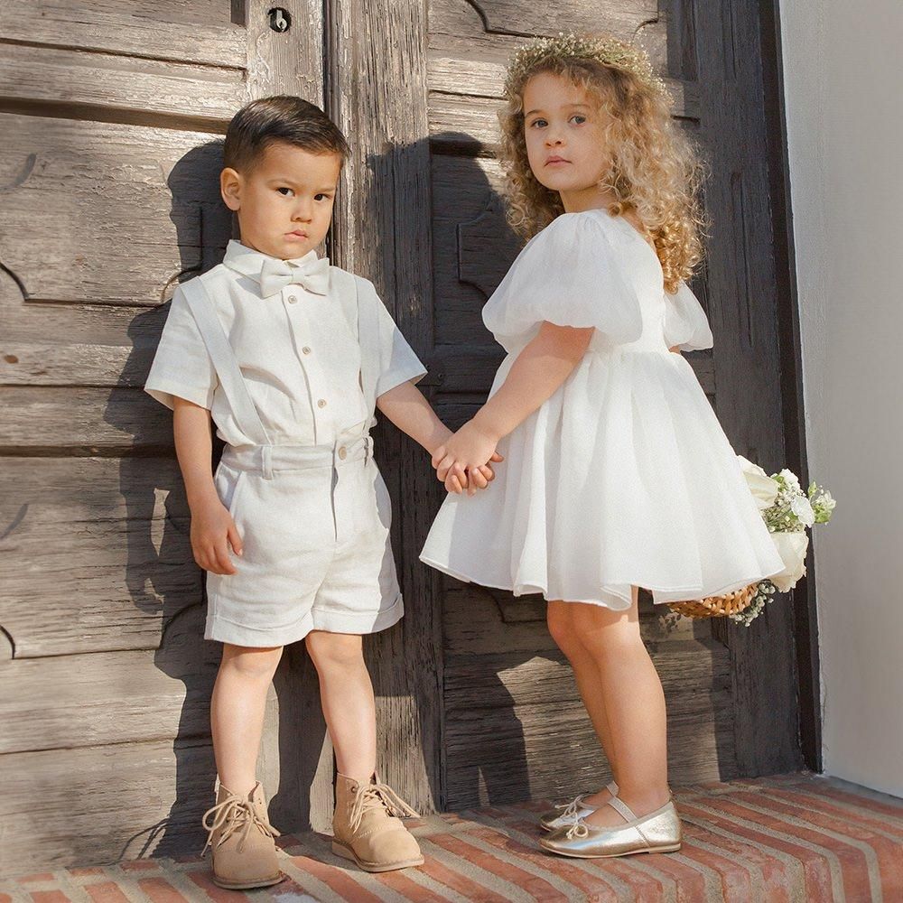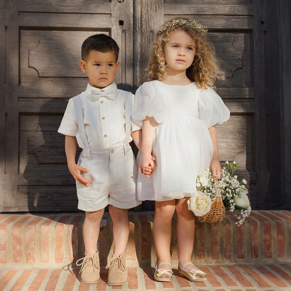 Noraleeで一番人気のSOFIA DRESS。シュリンク加工されたオーガンジーがエアリーで清麗な雰囲気です。スカート部分はチュール生地が挟まれており、ボリュームたっぷり。ほんのり透ける袖とたっぷりのフレアが特別感のあるドレスでお子さまの高潔さに相応しい純白カラーです。