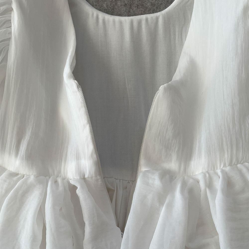 - 背中開き・コンシールファスナー有/袖口・ブルマウエスト・足口ゴム入り/スカート部分チュールあり/身頃のみ裏地あり