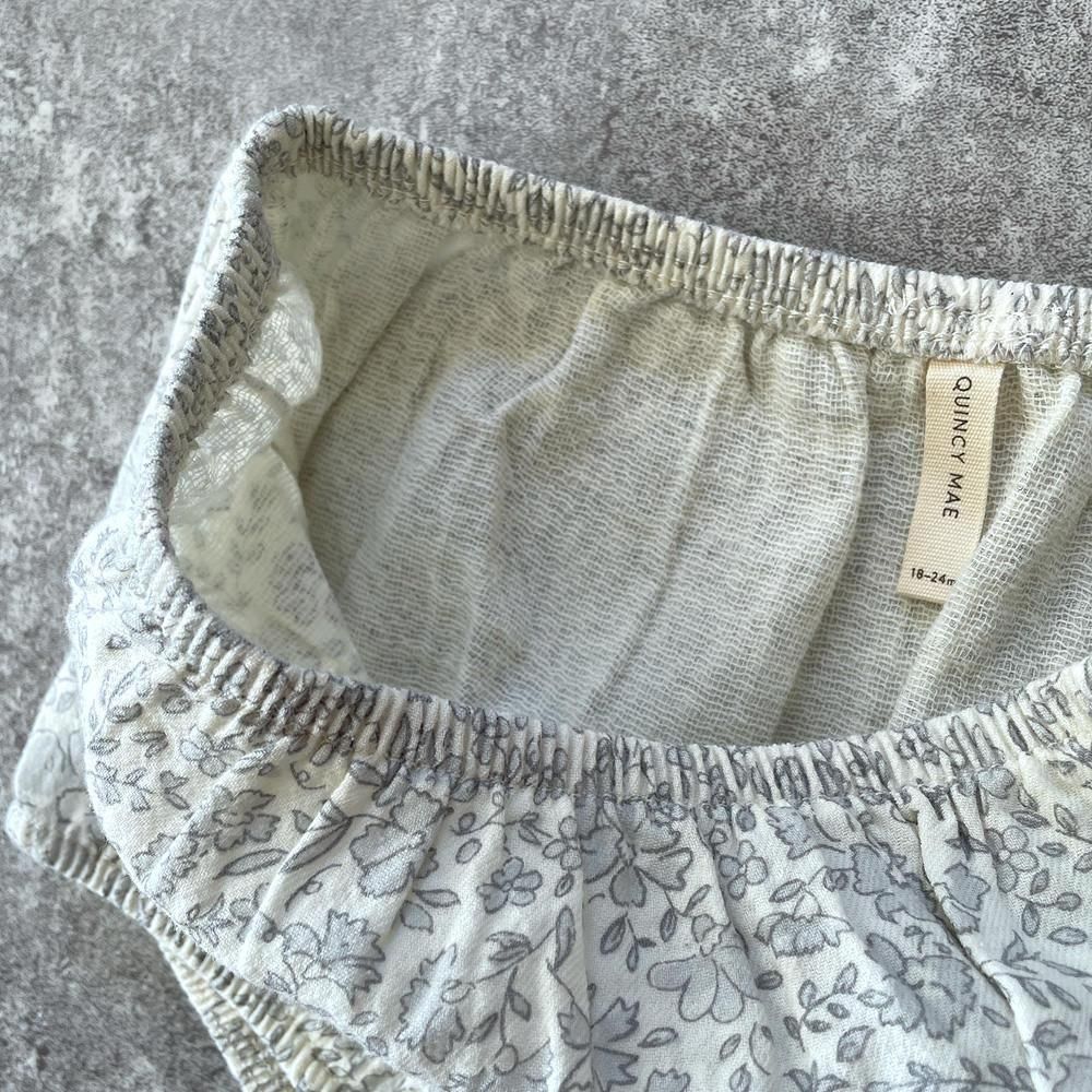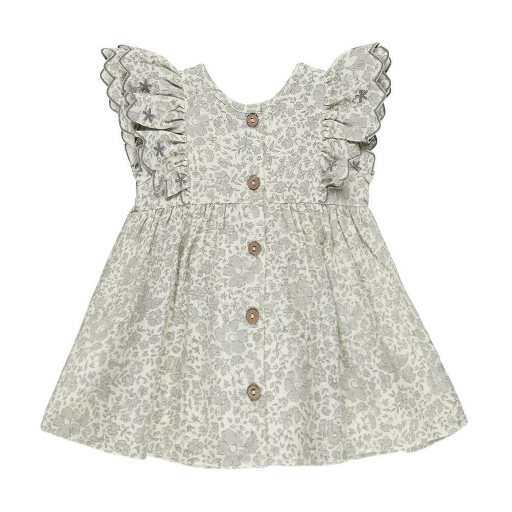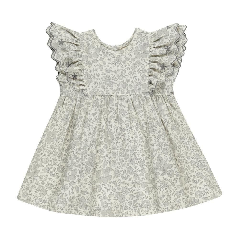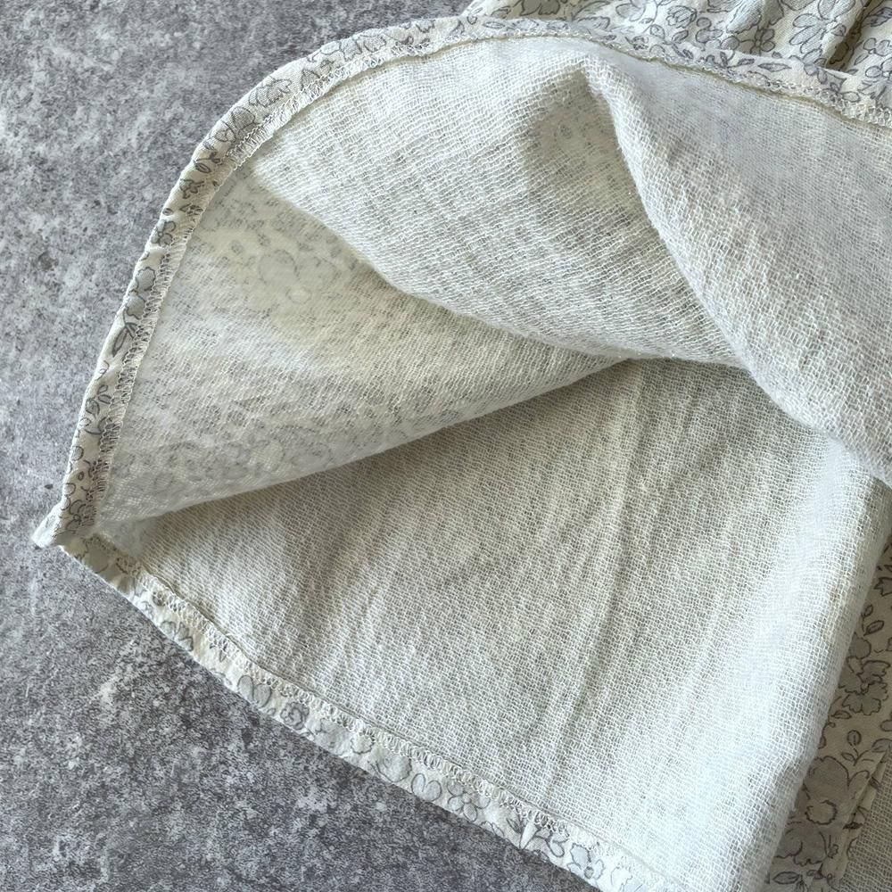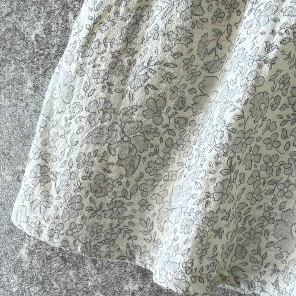 二重になったフリルの袖、刺繍のアクセントがかわいらしいワンピース。落ち着いたグレーの花柄で優しく品のある印象に。素材はオリジナルのクレープ生地で汗ばむ季節にもさらりとした肌あたりです。