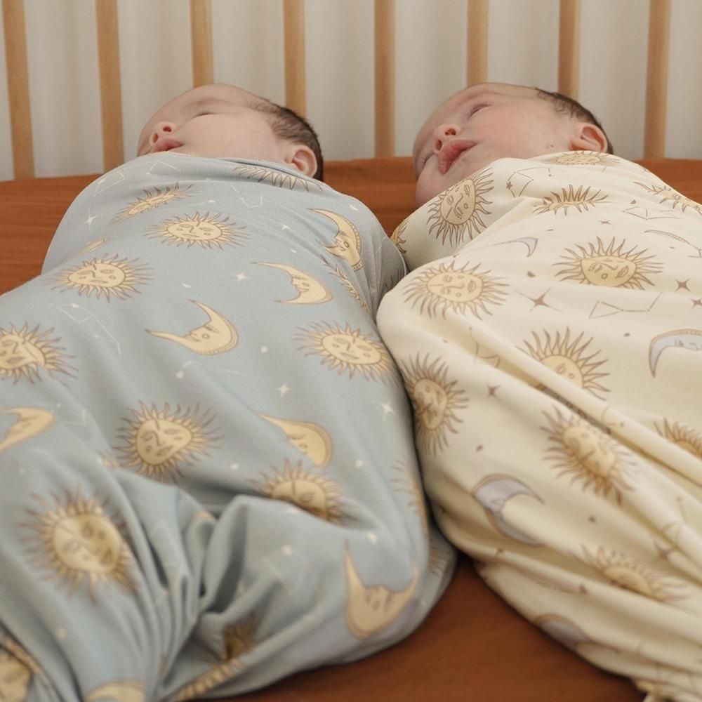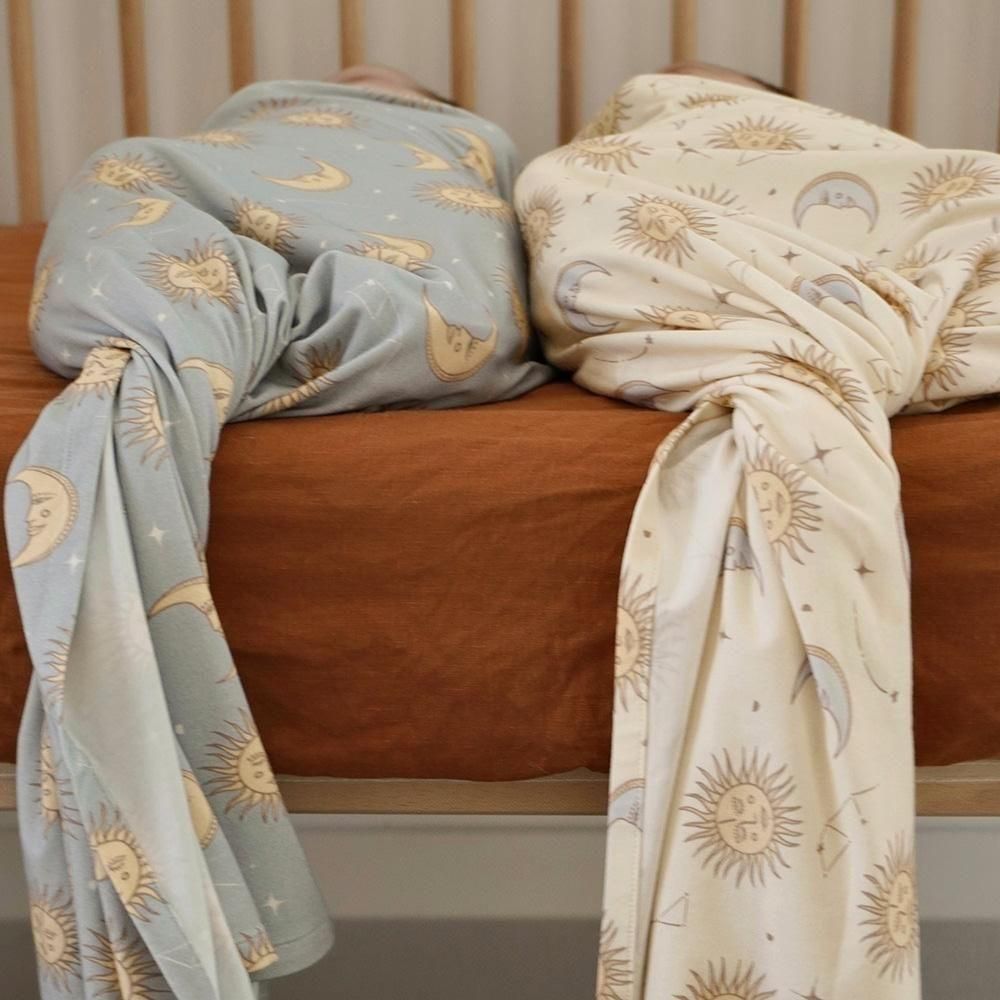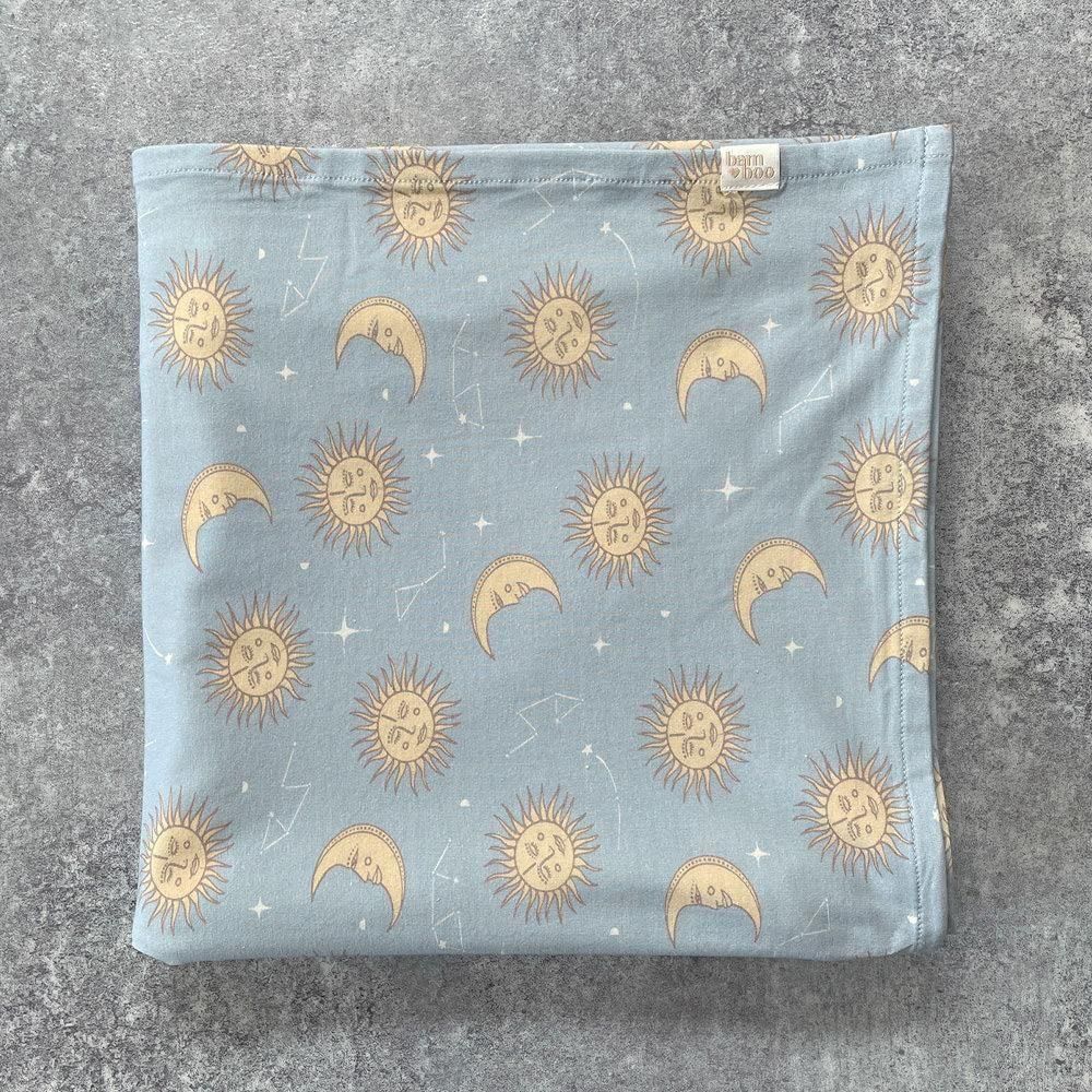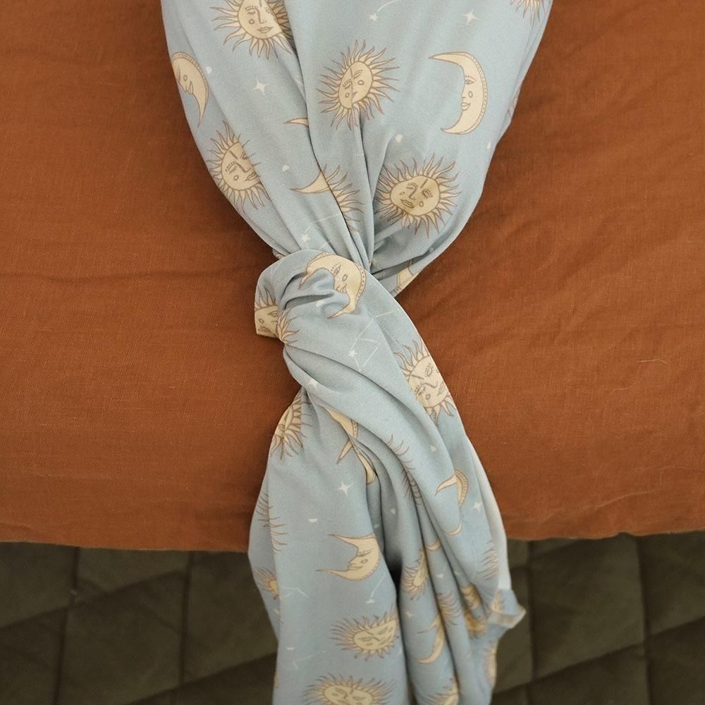 120cm × 120cmサイズの大判のスワドル(おくるみ)。伸縮性の良い生地に天体をモチーフにしたユニークなヴィンテージプリントが施されています。環境に優しい染料と無害なインクを使用しており、巾着袋付きでギフトにもおすすめです。
