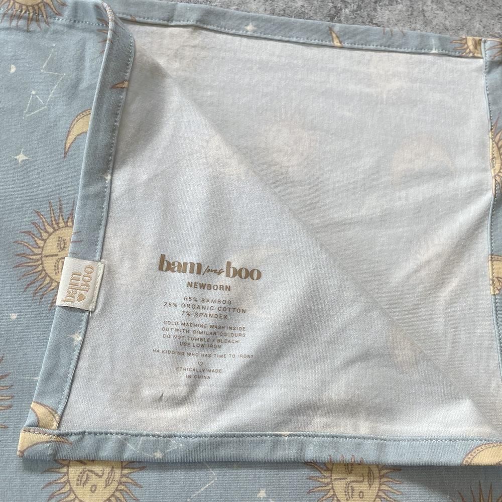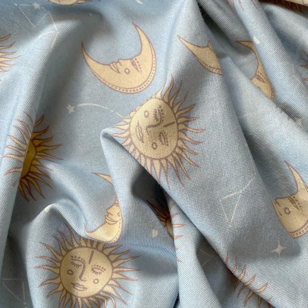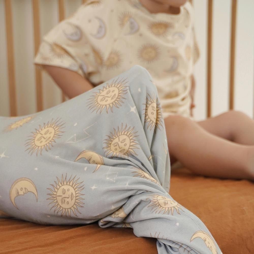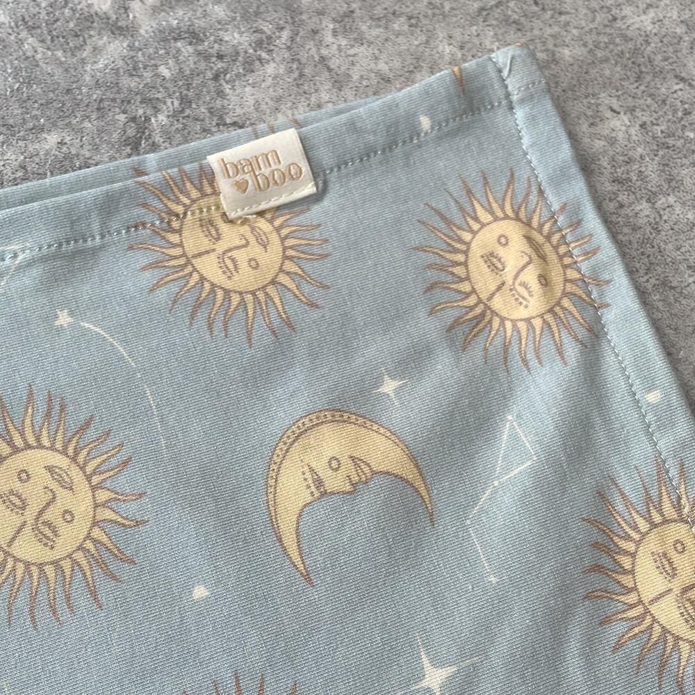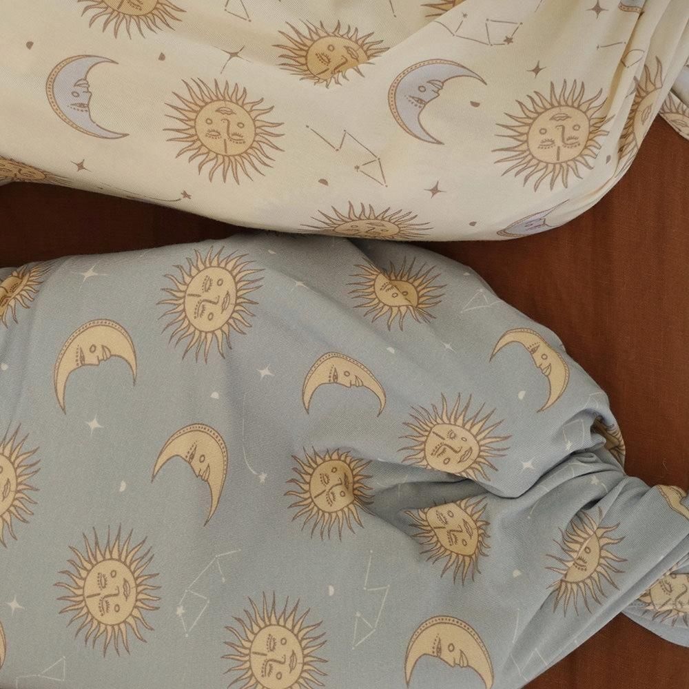 120cm × 120cmサイズの大判のスワドル(おくるみ)。伸縮性の良い生地に天体をモチーフにしたユニークなヴィンテージプリントが施されています。環境に優しい染料と無害なインクを使用しており、巾着袋付きでギフトにもおすすめです。