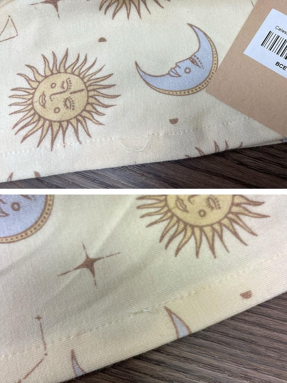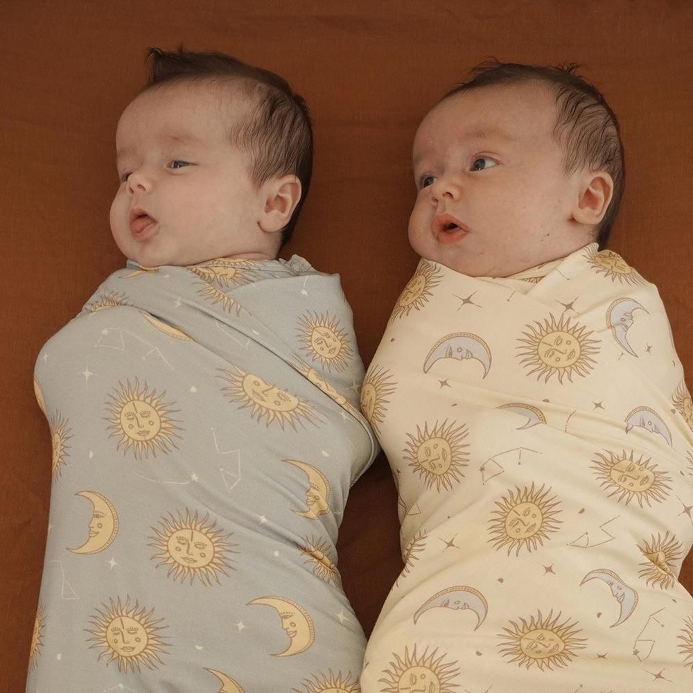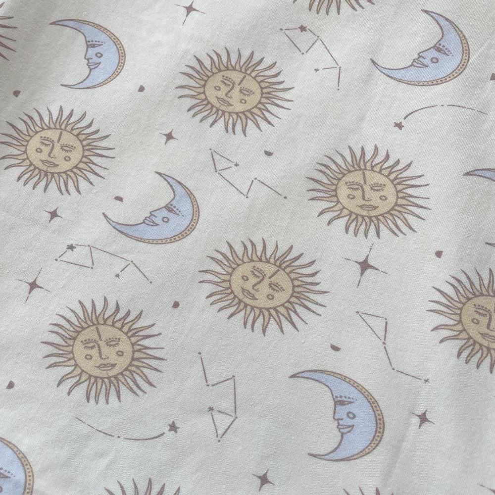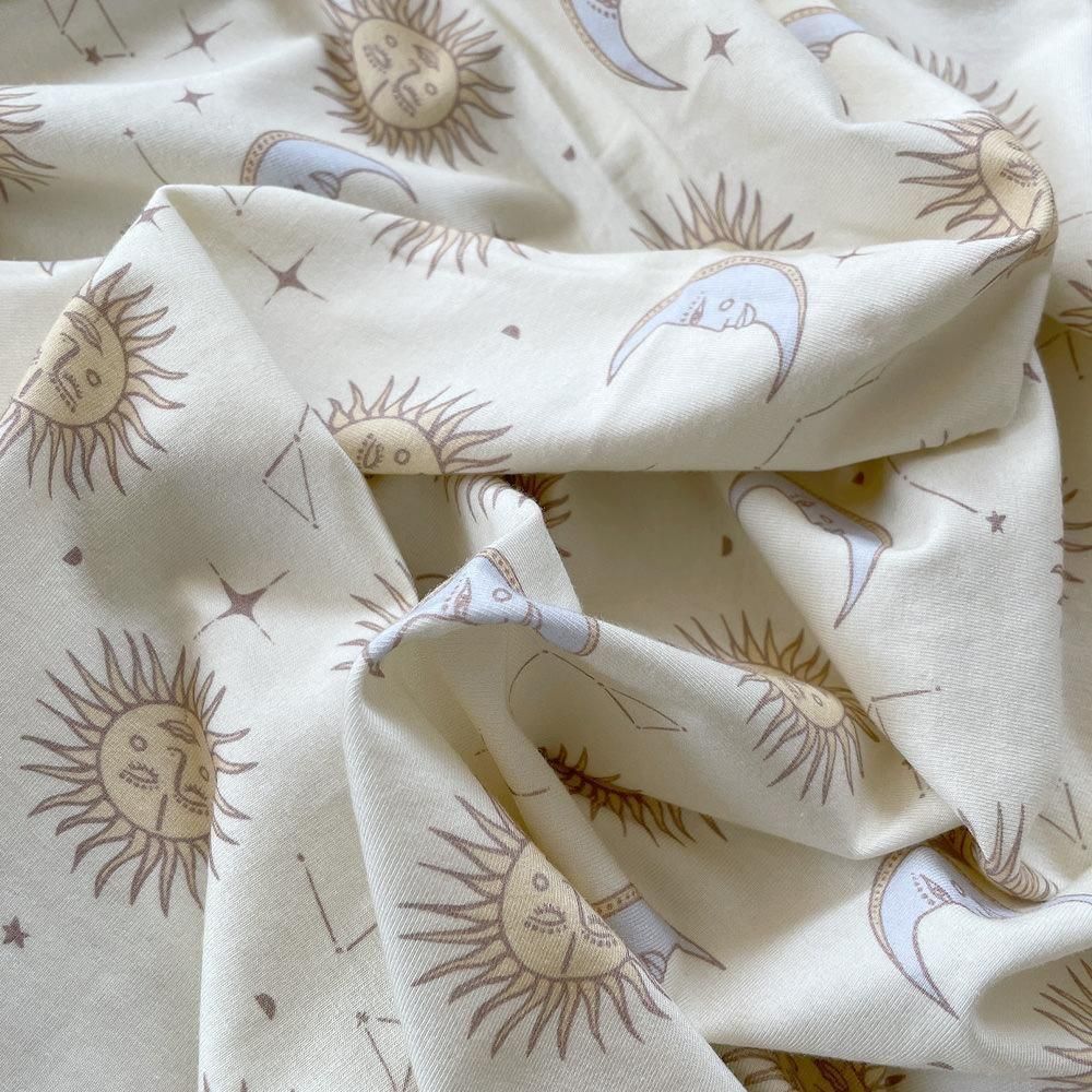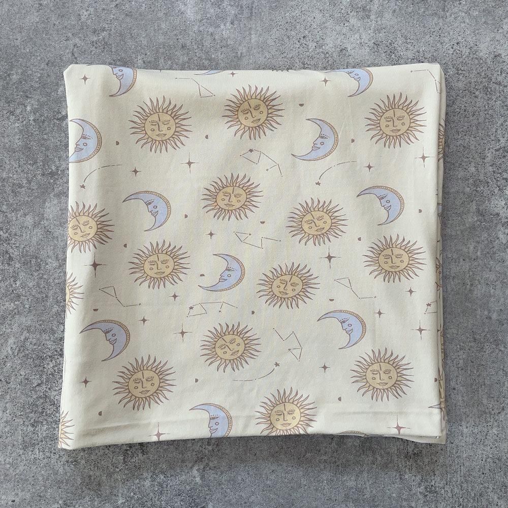 120cm × 120cmサイズの大判のスワドル(おくるみ)。伸縮性の良い生地に天体をモチーフにしたユニークなヴィンテージプリントが施されています。環境に優しい染料と無害なインクを使用しており、巾着袋付きでギフトにもおすすめです。