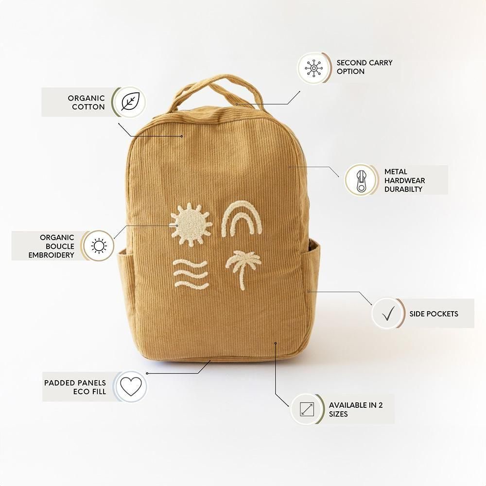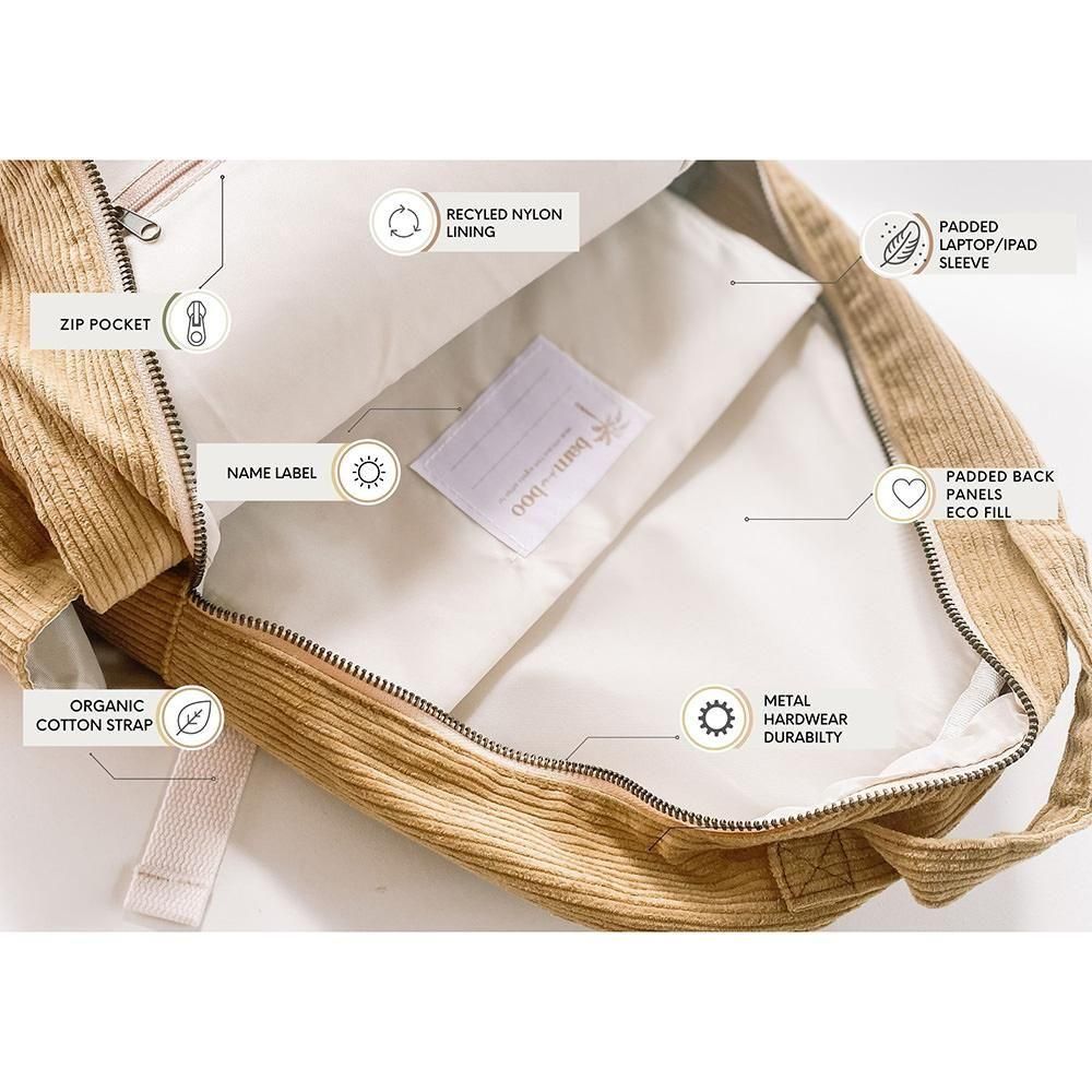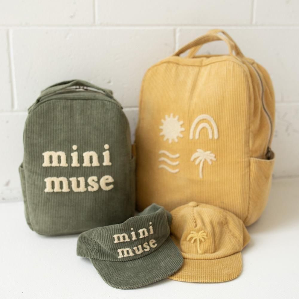 洗練されたナチュラルデザインと機能性を兼ね備えた、エコフレンドリーなバックパック。やわらかなクリームカラーのコーデュロイに、ブークレ刺繍であしらったMINI MUSEがアクセント。