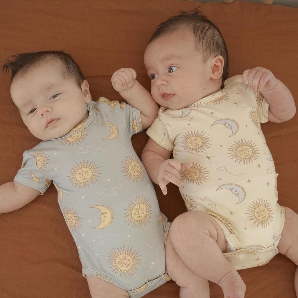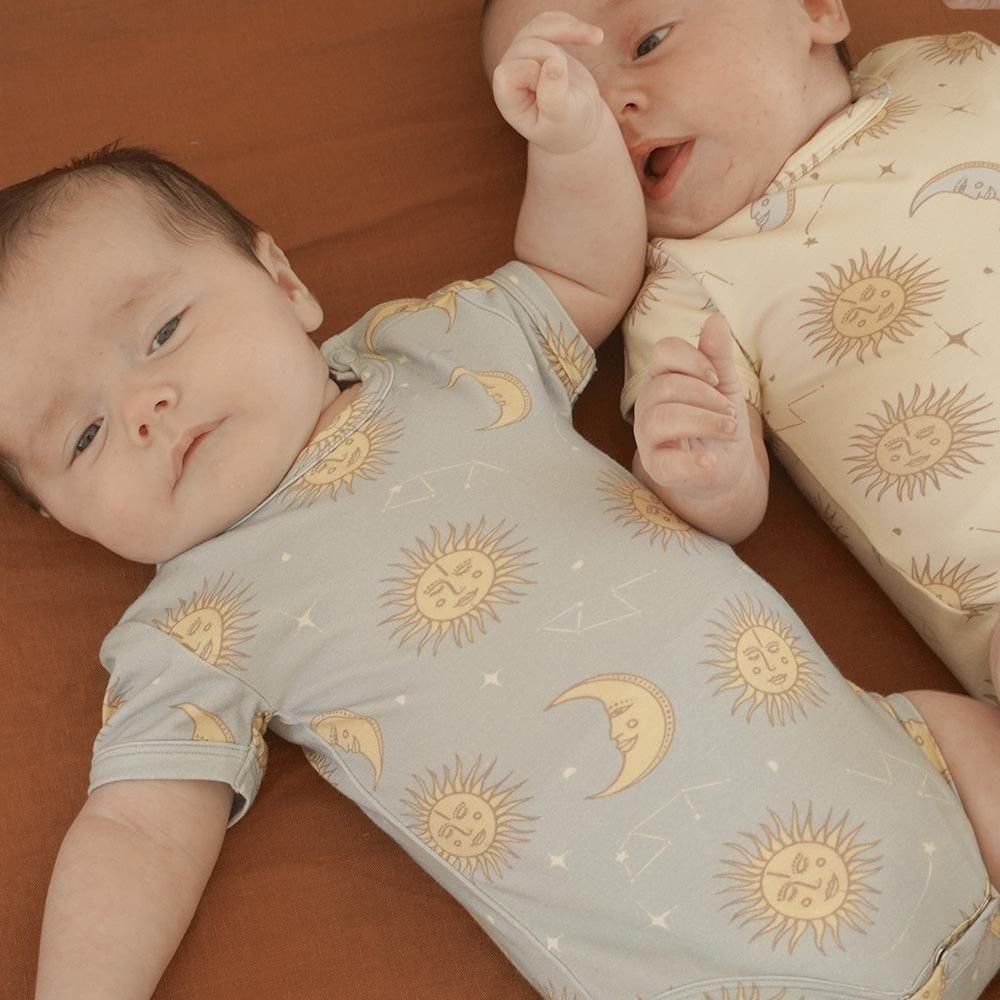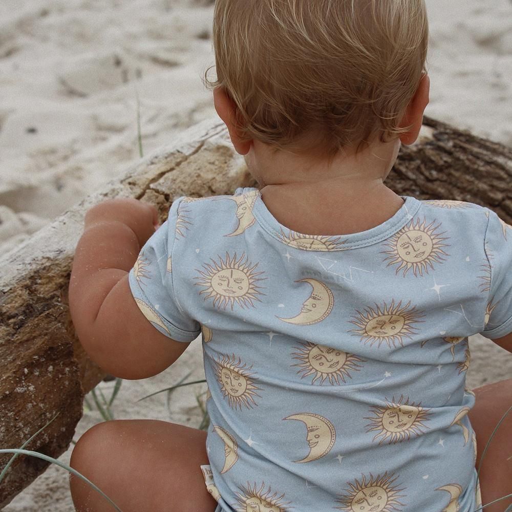 ソフトで伸縮性のあるバンブーオーガニックコットンを使用した、ノスタルジックな天体プリントの半袖のボディです。環境に優しい染料と無害なインクを使用しています。