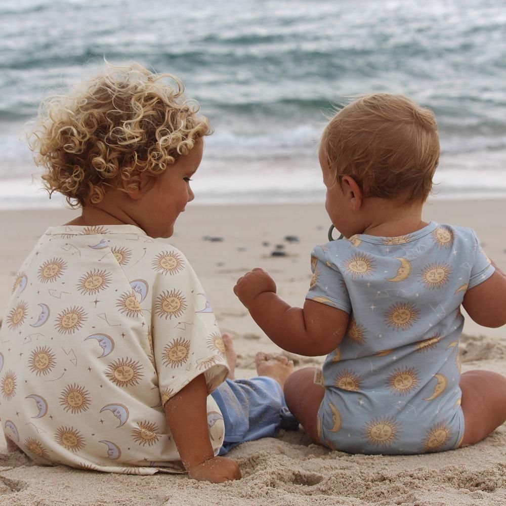 双子は生後10週間でサイズ0-3Mを、砂浜にいる子は1歳で12-18Mサイズを着用しています。