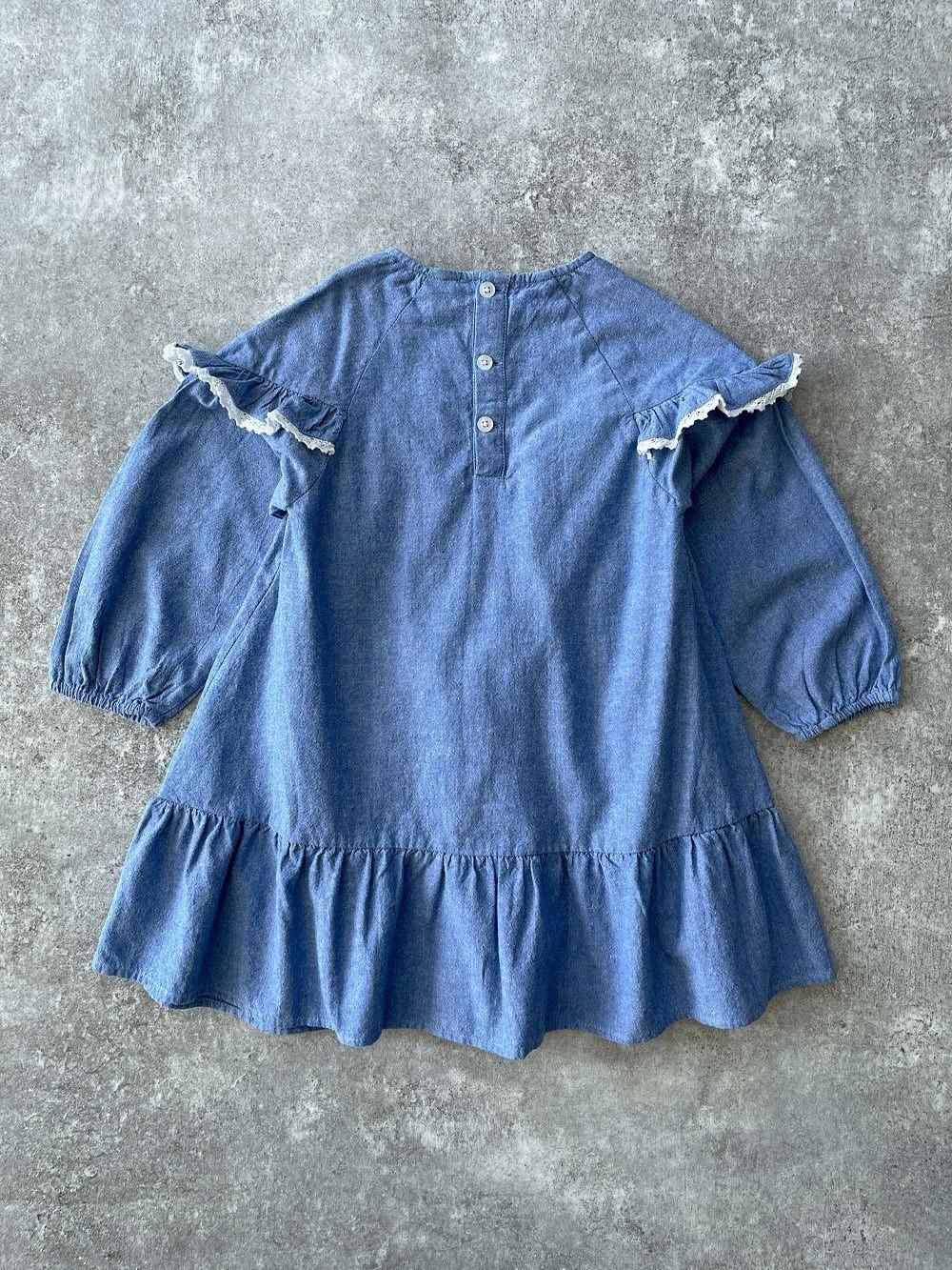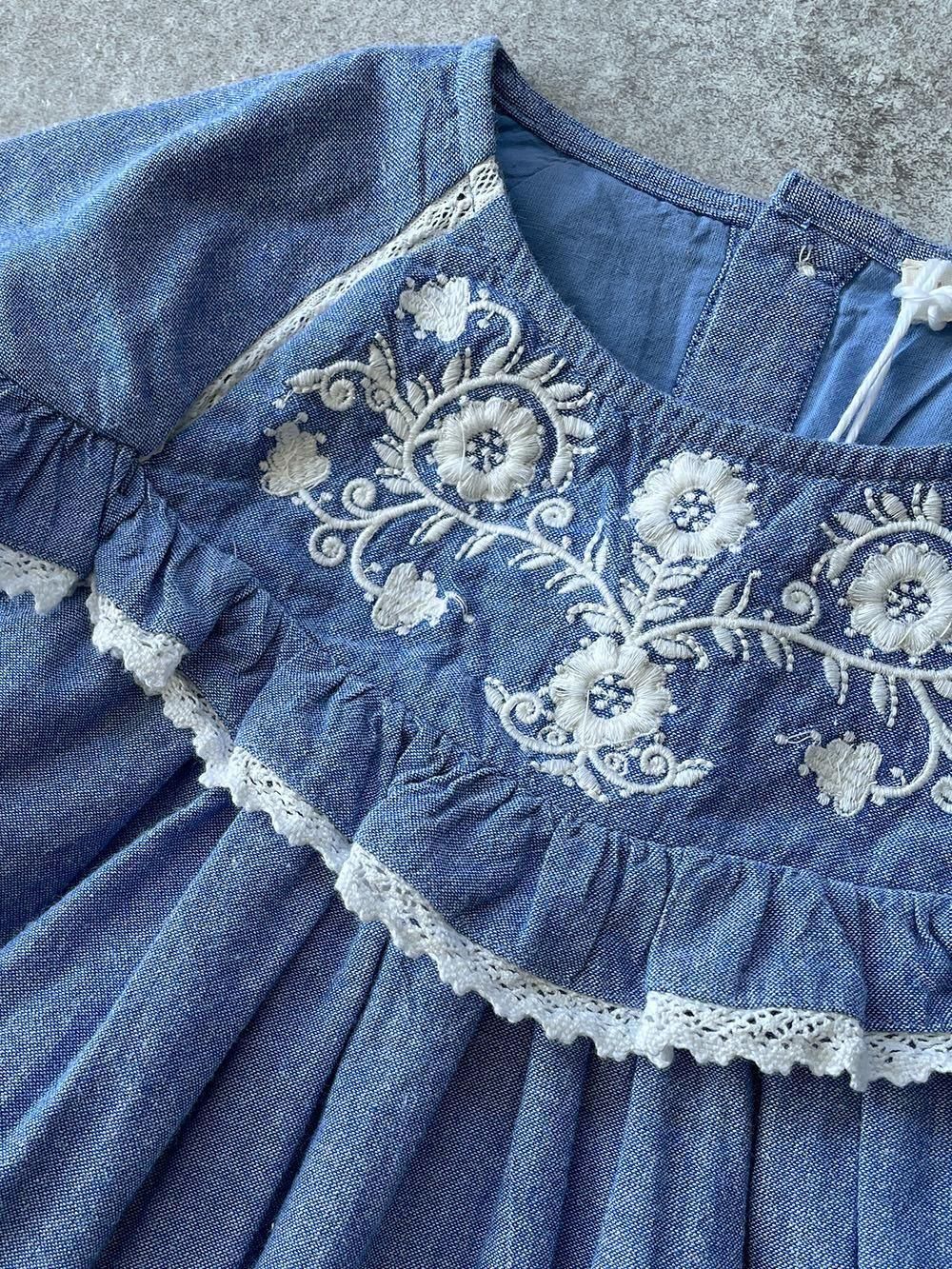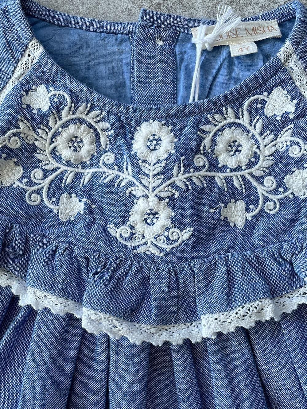 シャンブレー生地にLouise Mishaらしい刺繍が施されたワンピース。右腕から左腕までぐるっと付いたフリルが表情豊かなワンピースに仕立てています。