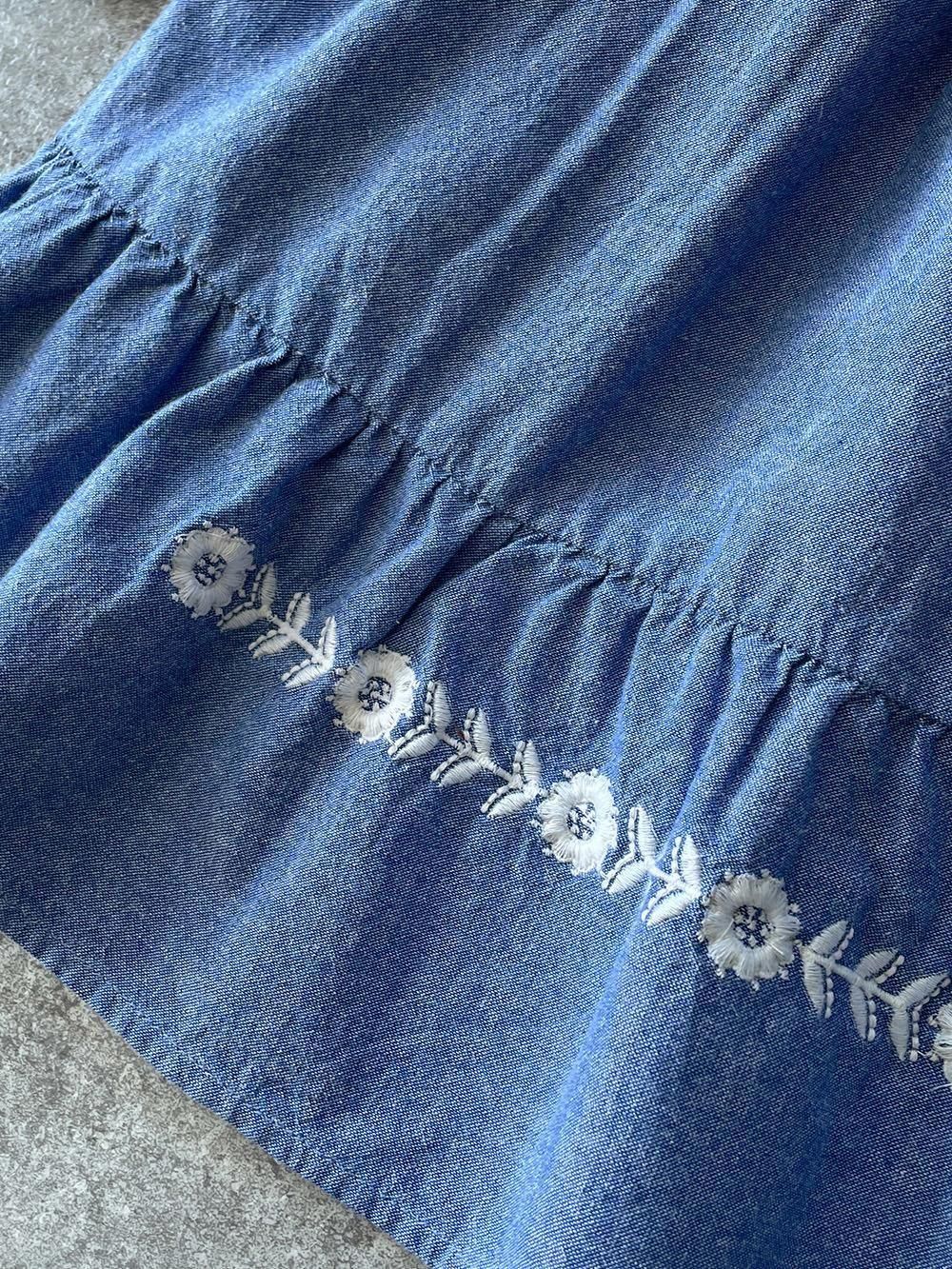 シャンブレー生地にLouise Mishaらしい刺繍が施されたワンピース。右腕から左腕までぐるっと付いたフリルが表情豊かなワンピースに仕立てています。