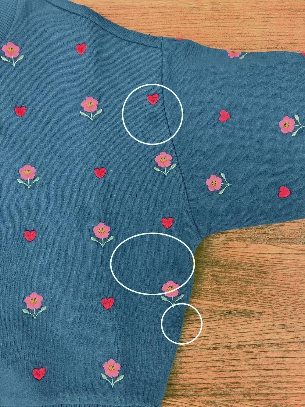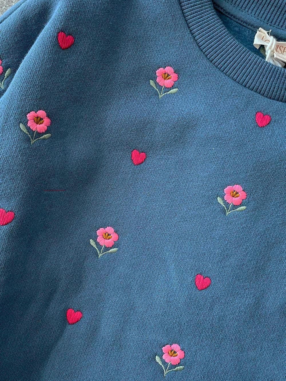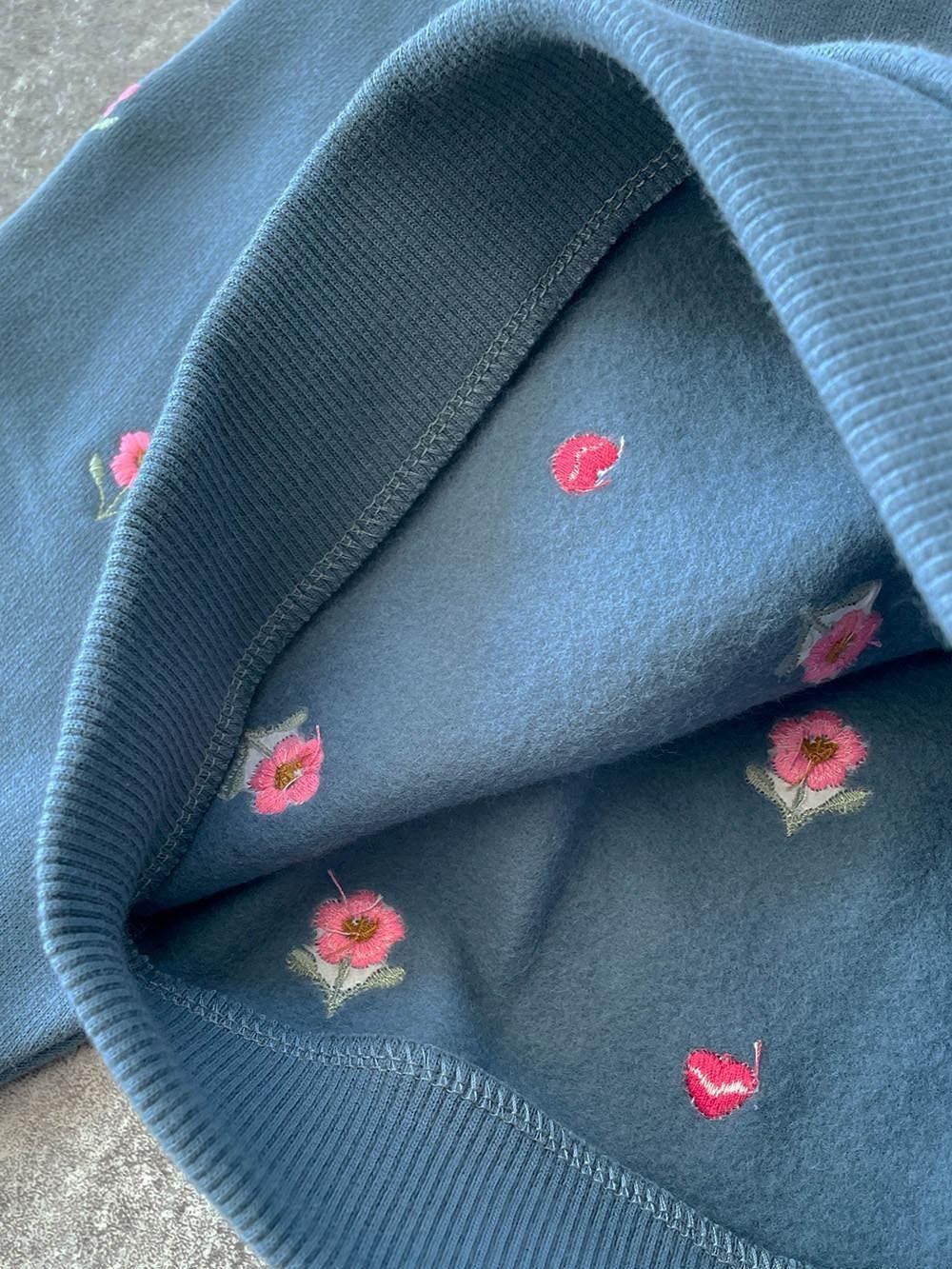 小さなお花の刺繍が施されたスウェット。裏起毛で暖かく、寒い時期を可愛く快適に過ごせる一枚です。