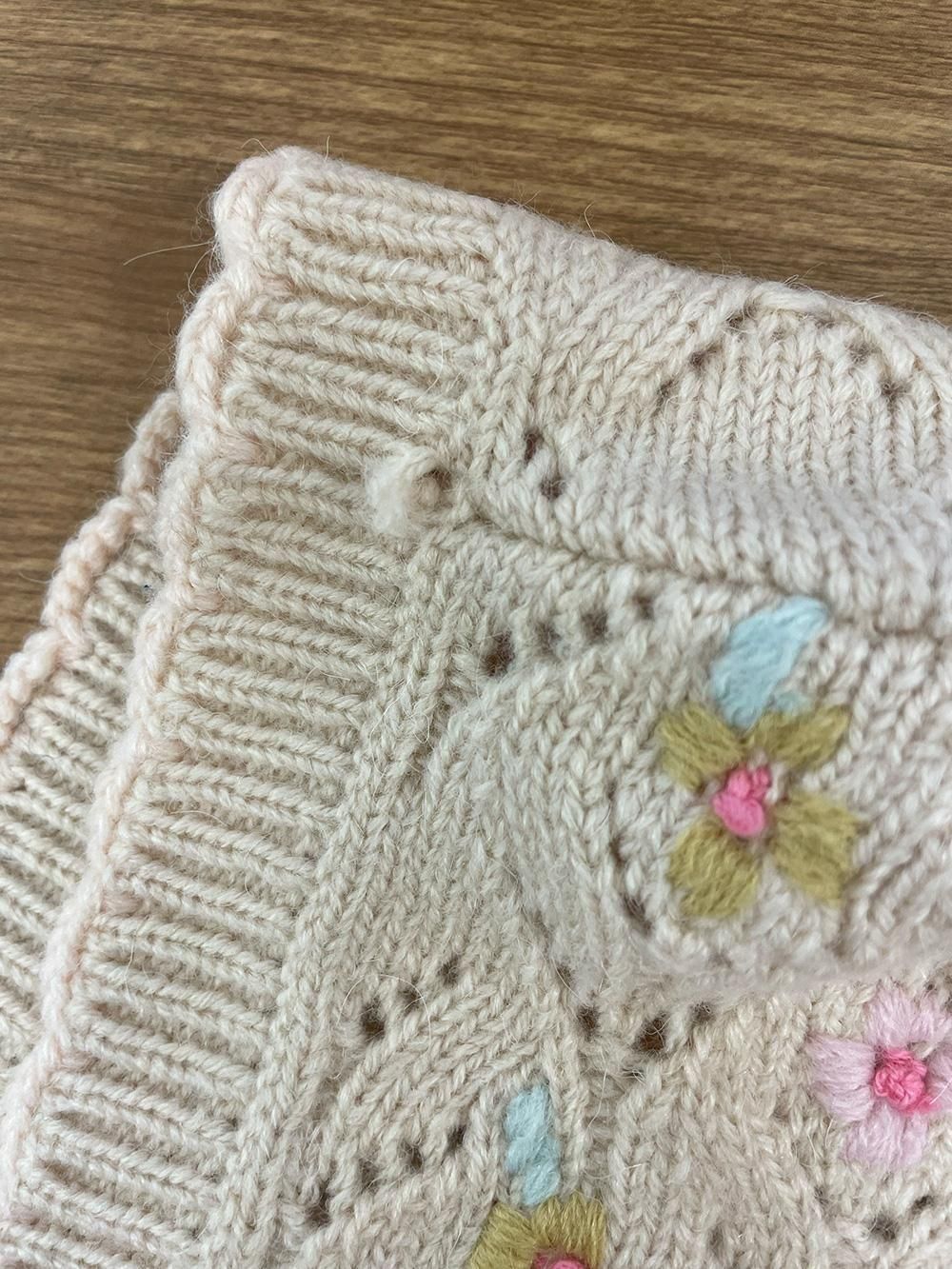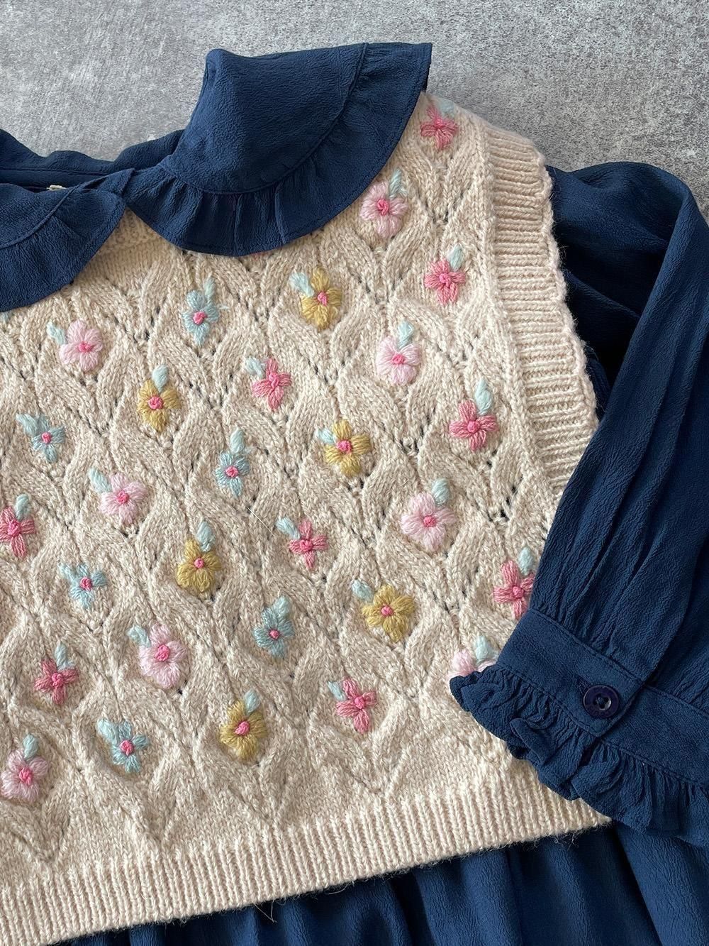 かわいらしい色味のお花の刺繍が施されたニットベスト。脇下を紐で結ぶタイプで総開きなので、ドルマンスリーブのワンピースやブラウスにも合わせていただけます。かわいらしさと暖かさをプラスしてくれる、一枚あると便利なアイテムです。
