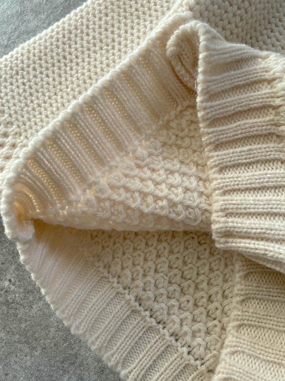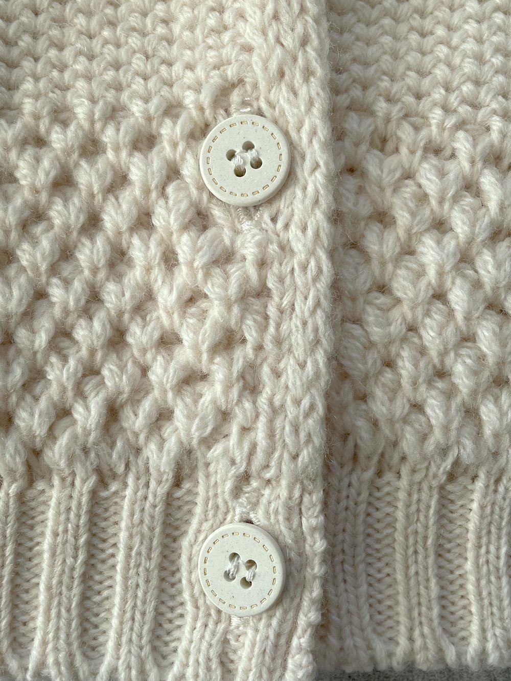 柔らかなアイボリーカラーでどんなコーディネートにも合わせやすいカーディガン。胴や袖の途中で編み模様が切り替わるデザインがアクセントになり、単色ながらも単調にならず洗練された印象を与えます。シンプルでありながらディテールにこだわりを感じられる一枚です。
