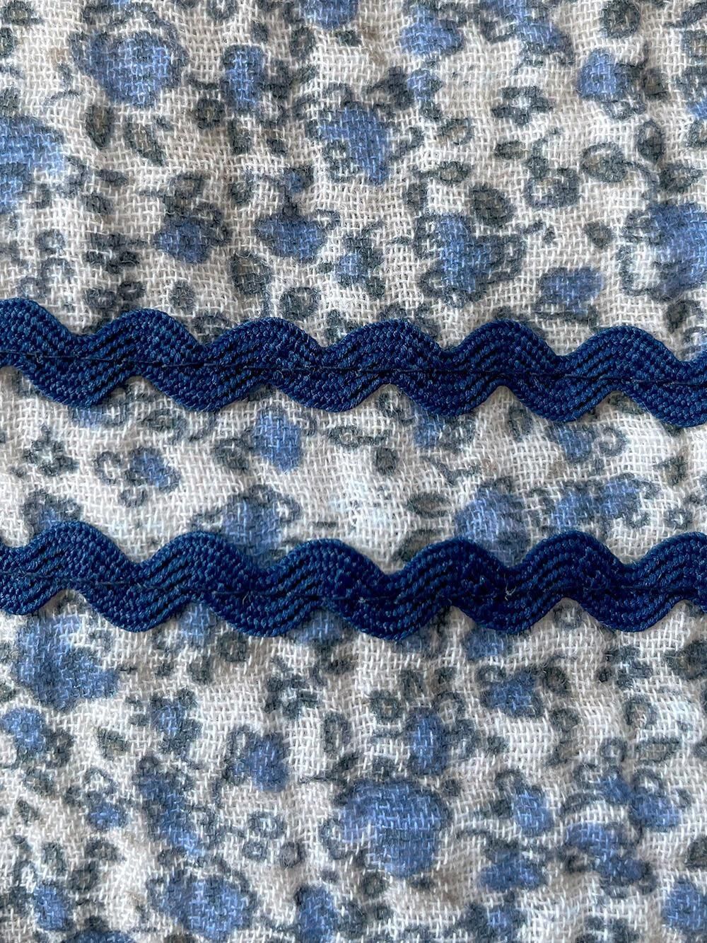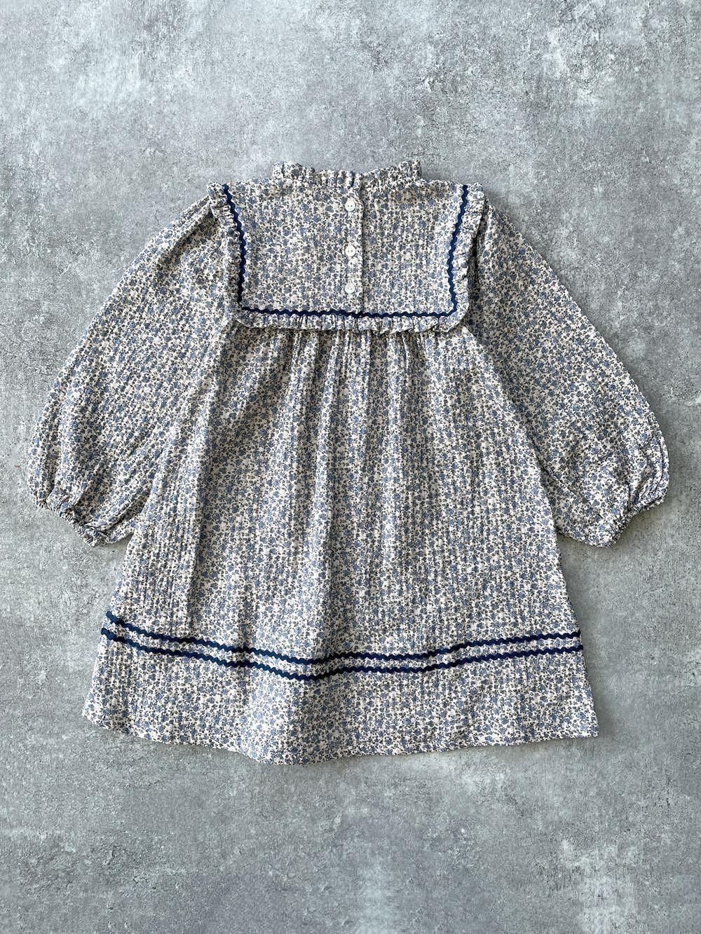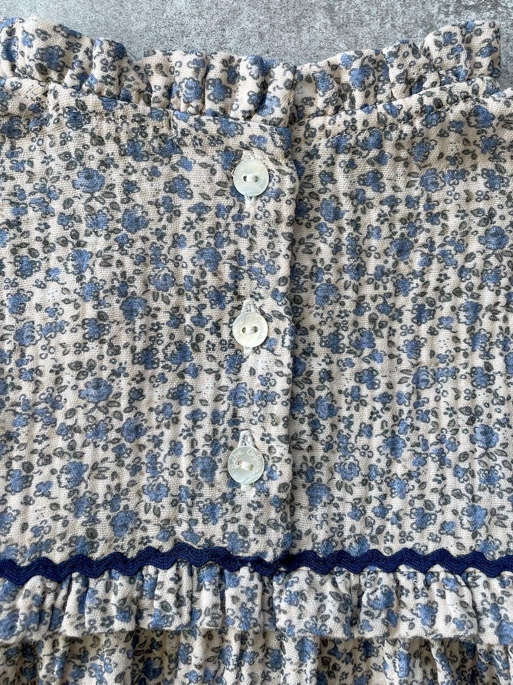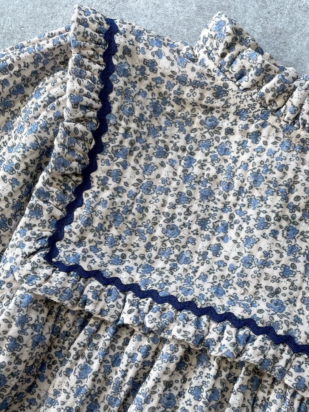 ヴィンテージの幼少期の思い出からインスパイアされた、愛らしい Carlotta ドレス。空色のフローラルプリントを、柔らかなオーガニックコットン100%で仕立て、ネイビーブルーのベルベットテープで縁取った上品なデザインです。胸元と襟にはやさしいラッフルをあしらい、バルーンスリーブが可憐なシルエットを演出。見た目の華やかさと心地よい着用感を両立した一着です。
