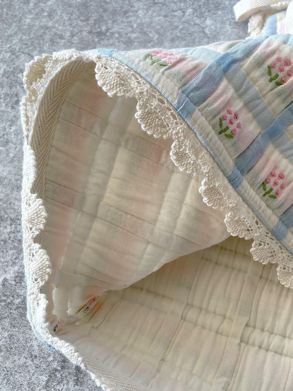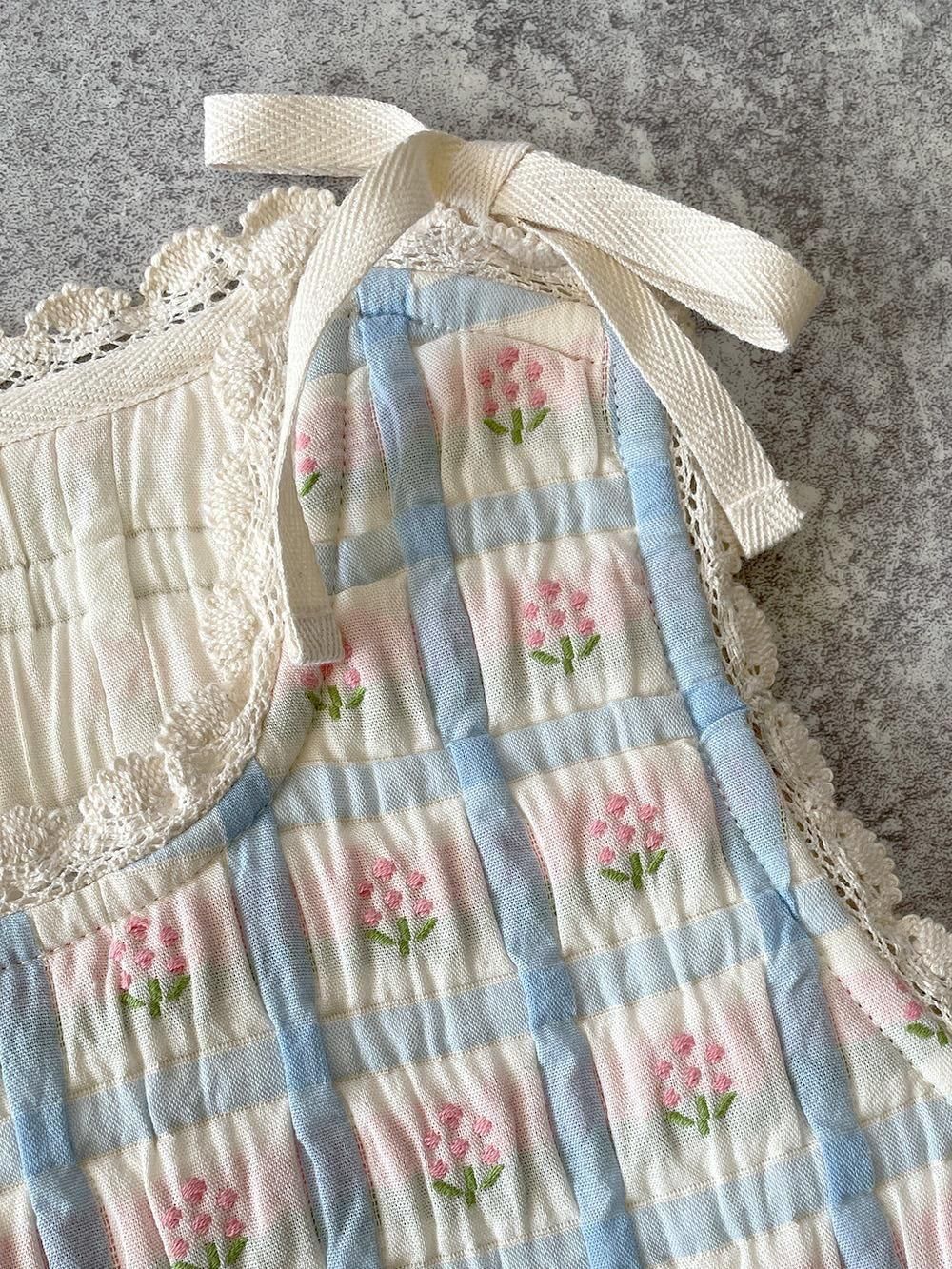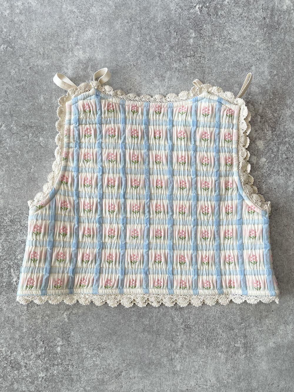秋の定番アイテム、Zora ベスト。ふんわりとした中綿入りのコットンブレンド素材で仕立てられ、暖かさと軽やかさを兼ね備えています。ノスタルジックなフラワーチェック柄に、ショルダー部分のリボンタイと全体を縁取る繊細なレースが可憐なアクセント。 デイリーのお出かけにも、特別なシーンにも寄り添う、上品で着心地のよい一着です。Zora パンツとのコーディネートでセットアップとしてもお楽しみいただけます。