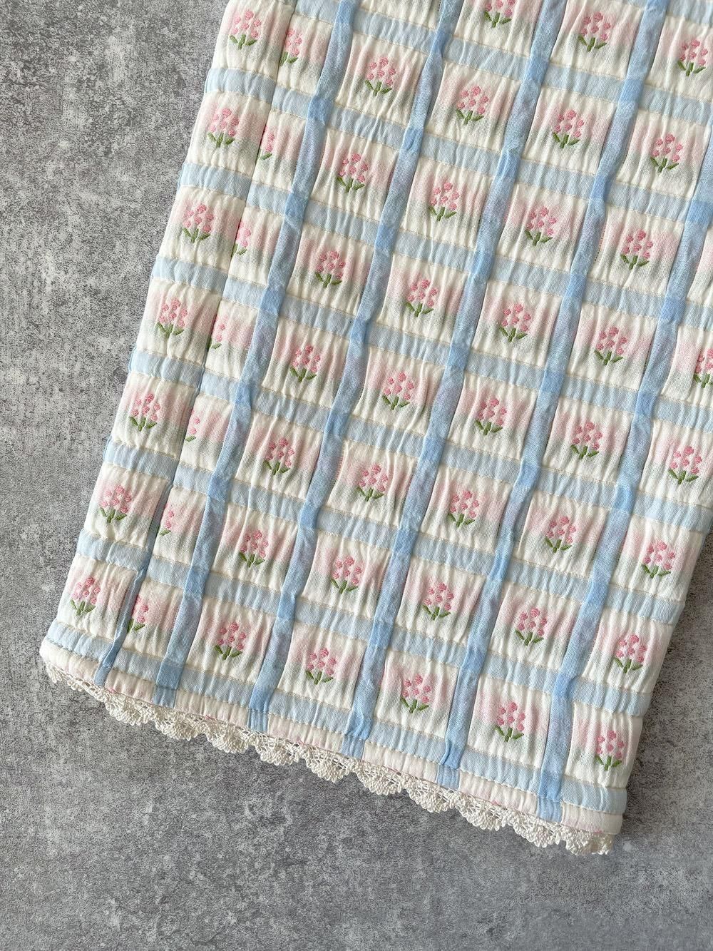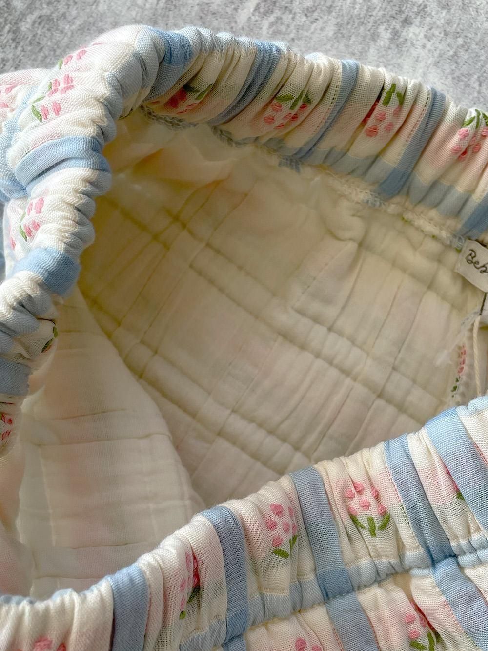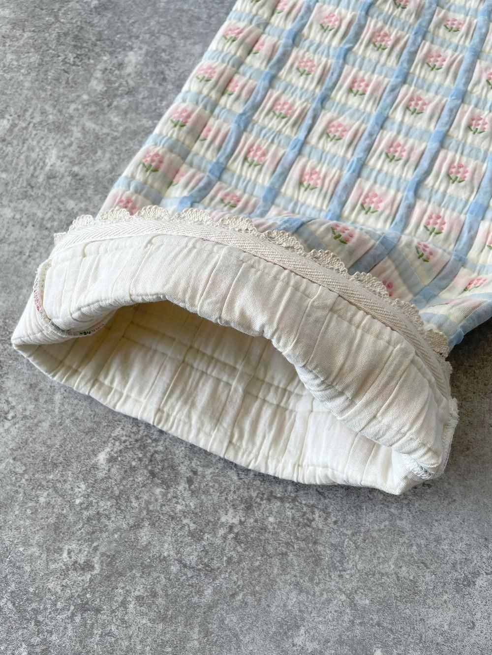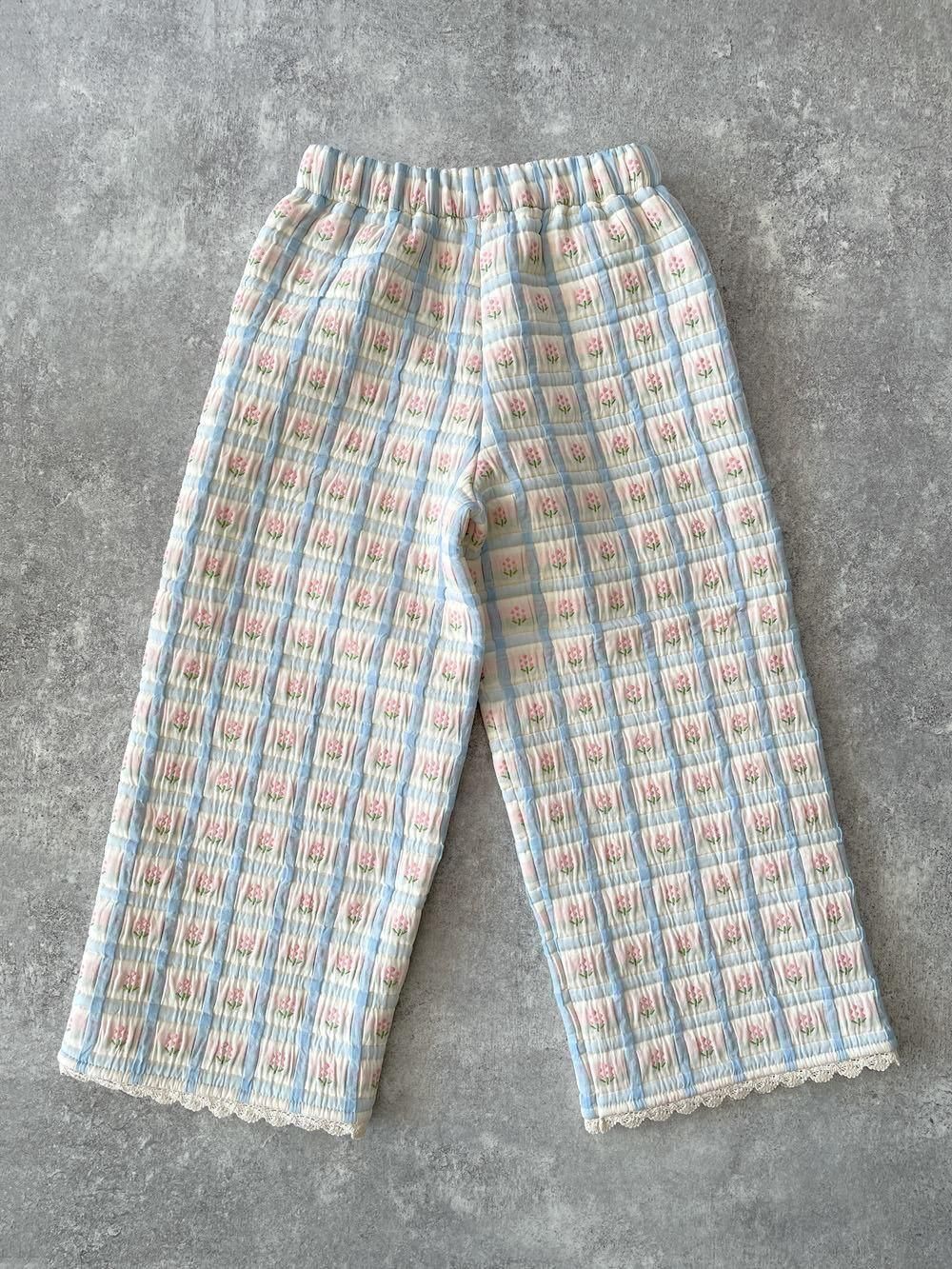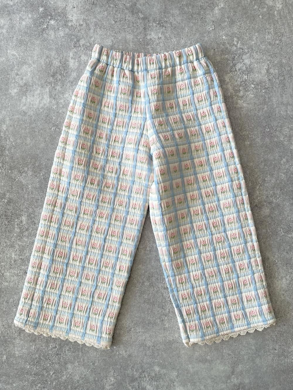 秋にぴったりの Zora パンツ。ふんわりとした中綿入りのコットンブレンド素材で仕立てられ、暖かみのあるはき心地が魅力です。ノスタルジックなフラワーチェック柄が可憐な印象を添え、ウエストはゴム仕様でリラックスしたフィット感に。裾には繊細なコットンレースをあしらい、上品さと愛らしさを兼ね備えています。 同シリーズの Zora ベスト と合わせれば、秋冬のおしゃれをさらに華やかに彩ります。