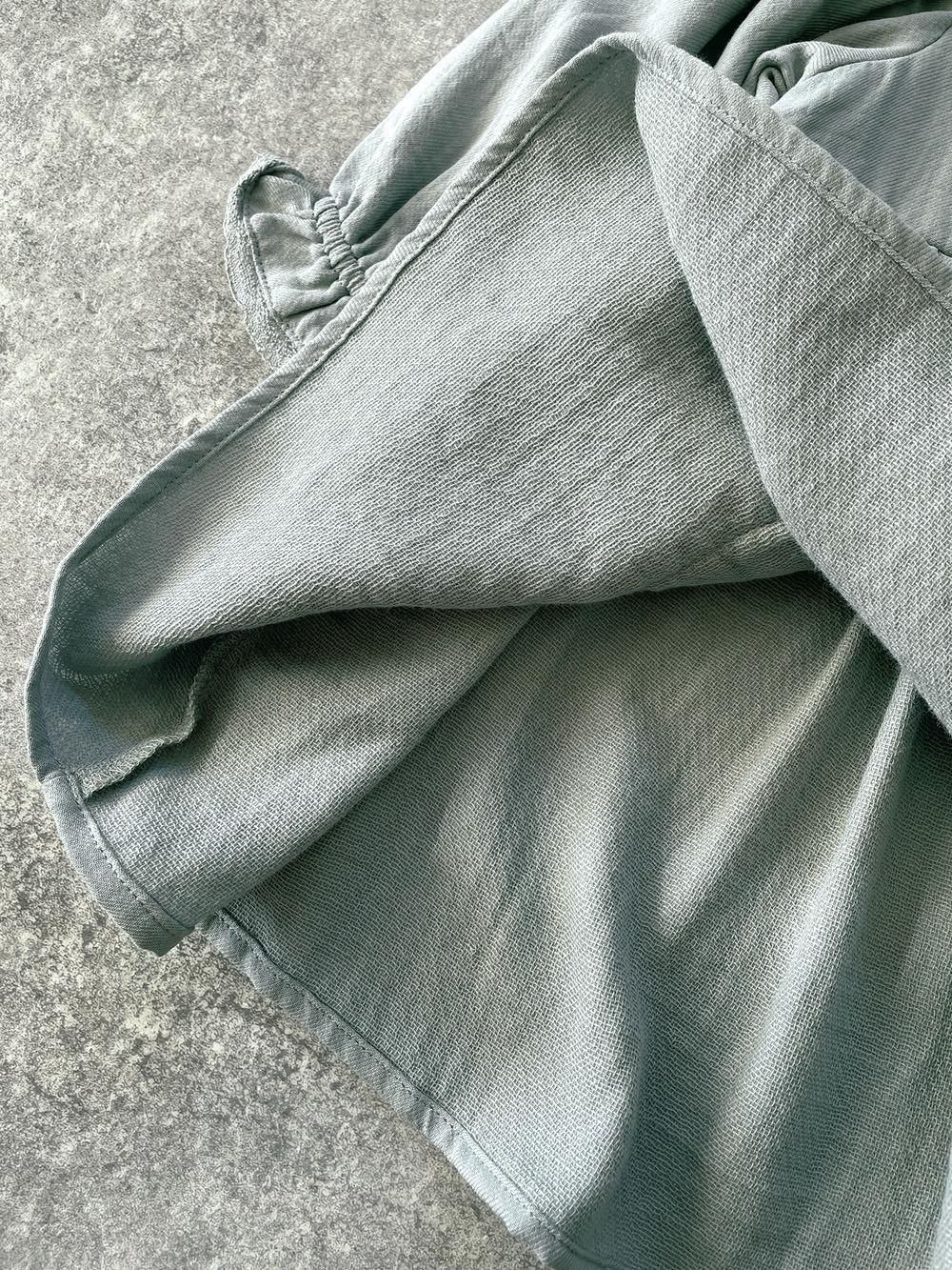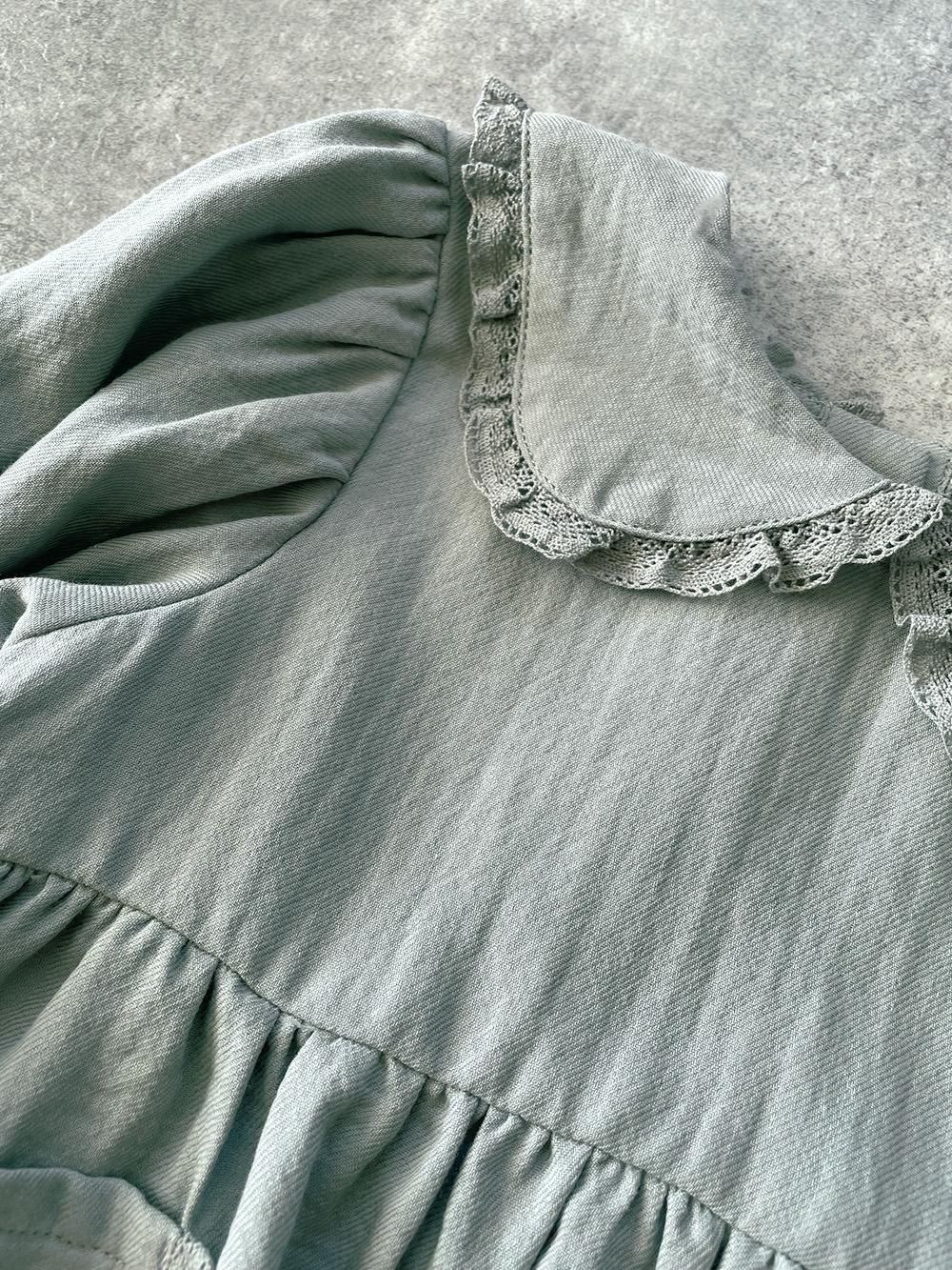 光の当たり方によってブルーグレーに見えたり、グリーンがかって見えたりする不思議なカラーのワンピース。色味は落ち着いたカラーですが、襟や袖、ポケットのレースやデザインが可愛らしい。薄手の生地なので、暑かったり寒かったりと落ち着かない季節にもおすすめです。冬はカラフルなカーディガンやタイツを合わせても可愛いですね。全サイズブルマ付きなのも嬉しいポイントです。