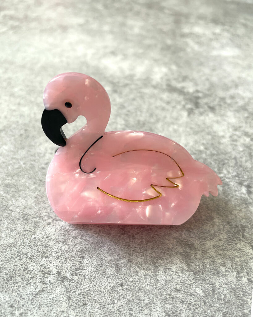 ポップなスタイリングのアクセントに、またリゾート気分を高めてくれるフラミンゴのクロークリップ。首まわりの線は黒で描かれているのに対し、羽を表すラインはゴールドで仕上げられています。