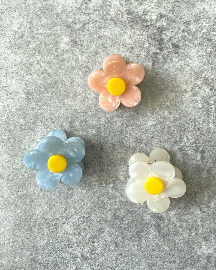 春らしい明るいカラーのデイジーがモチーフのクロークリップです。こちらもマーブル模様で上品な印象に。